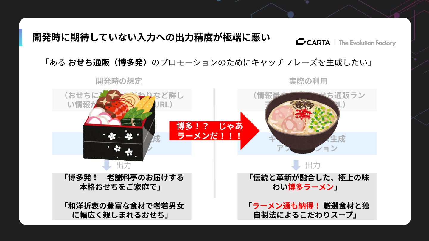 4. 開発時に期待していない⼊⼒への出⼒精度が極端に悪い キャッチフレーズ⽣成 アプリケーション 開発時の想定 (おせちに関するこだわりなど詳し い情報が載ったページの URL) 「ある おせち通販(博多発)のプロモーションのためにキャッチフレーズを⽣成したい」 ⼊⼒