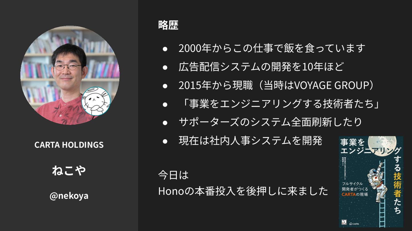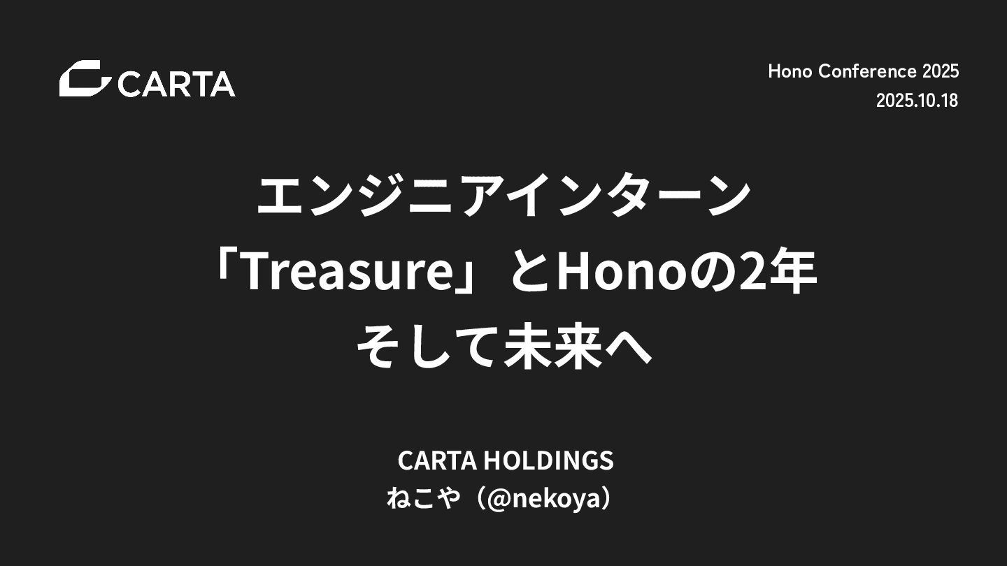エンジニアインターン 「Treasure」とHonoの2年 そして未来へ Hono Conference 2025 2025.10.18 CARTA HOLDINGS ねこや(@nekoya)