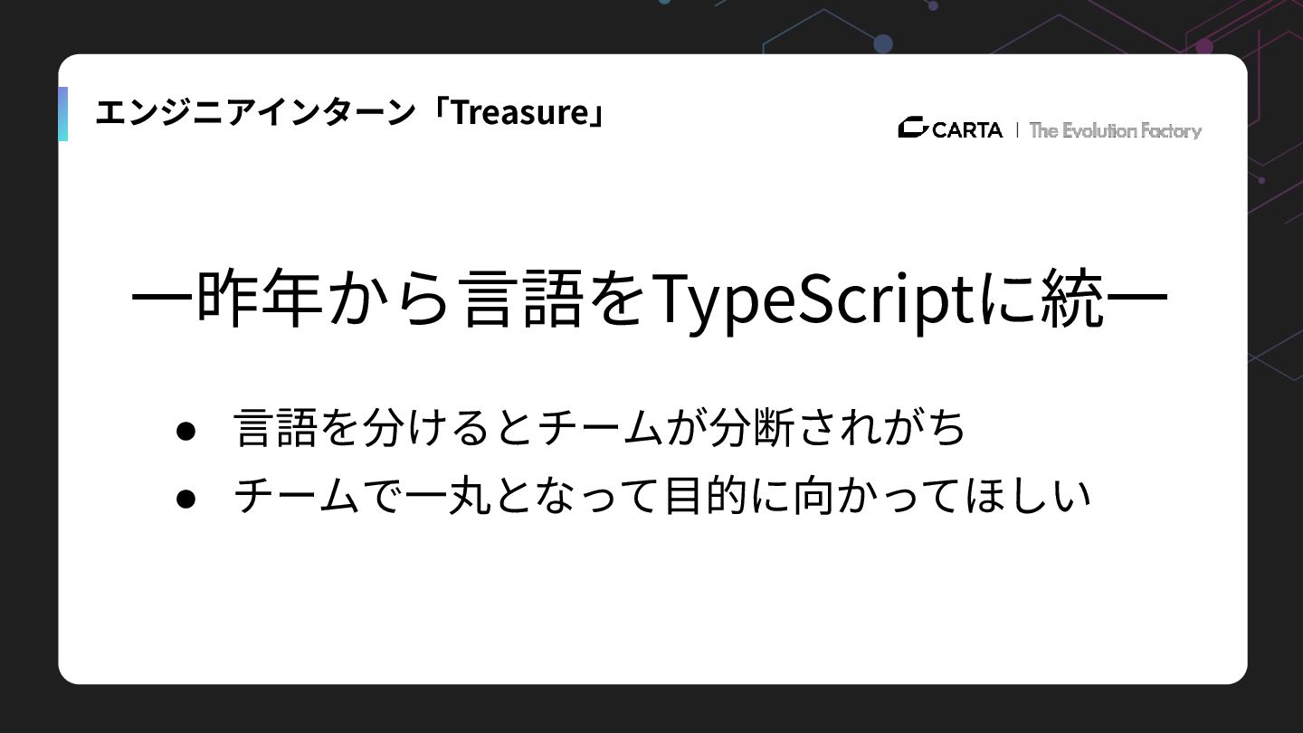 エンジニアインターン「Treasure」 昨年から⾔語をTypeScriptに統⼀ • ⾔語を分けるとチームが分断されがち • チームで⼀丸となって⽬的に向かってほしい