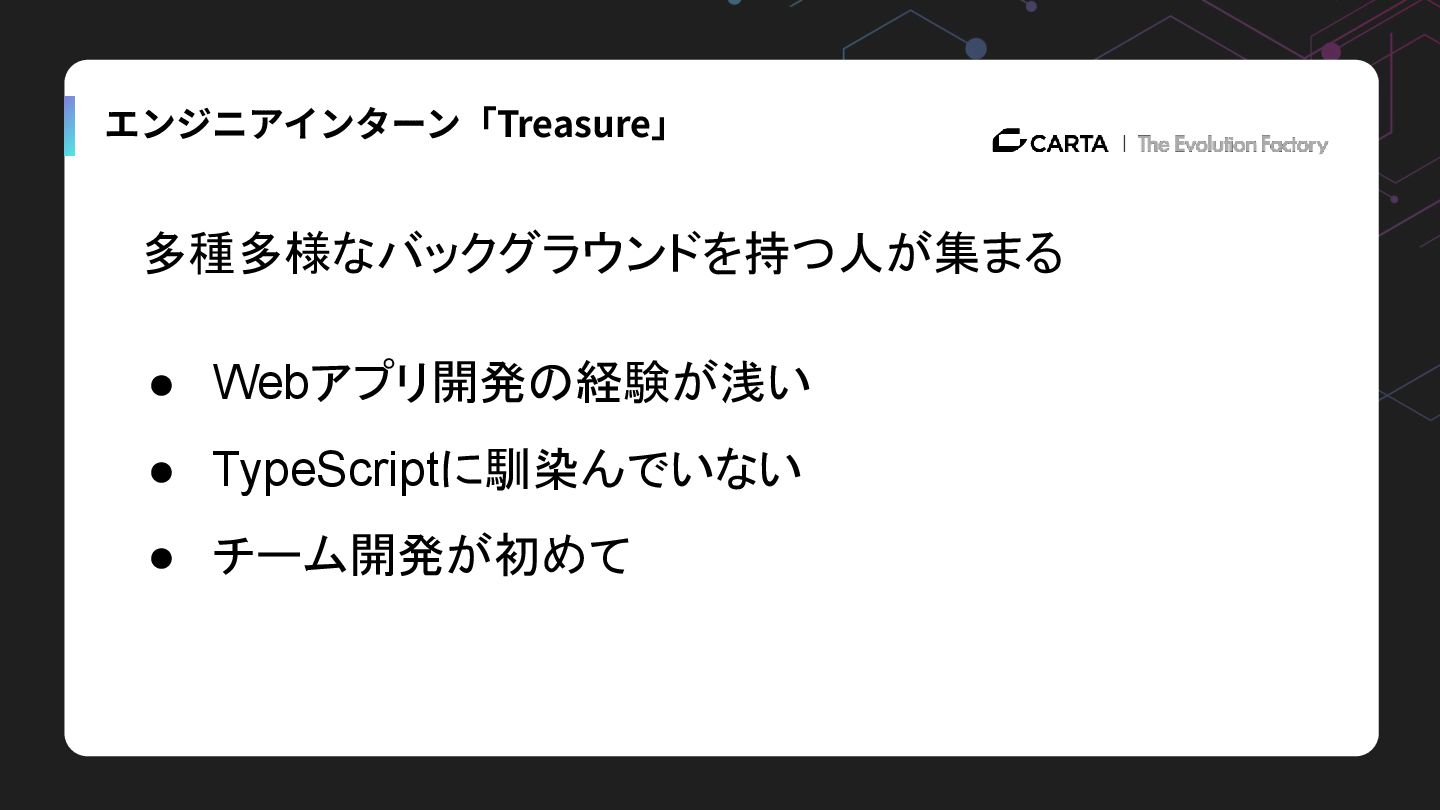 エンジニアインターン「Treasure」 多種多様なバックグラウンドを持つ人が集まる • Webアプリ開発の経験が浅い • TypeScriptに馴染んでいない • チーム開発が初めて