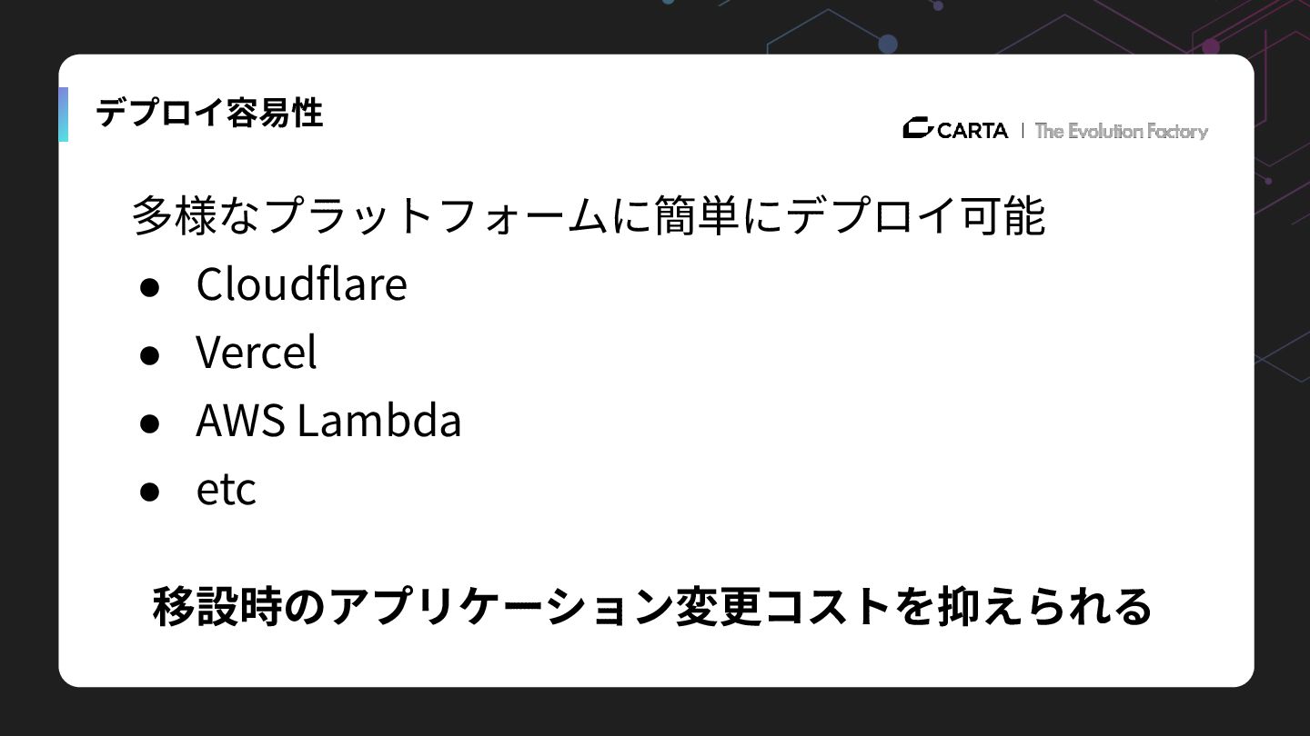 デプロイ容易性 多様なプラットフォームに簡単にデプロイ可能 • Cloudflare • Vercel • AWS Lambda •