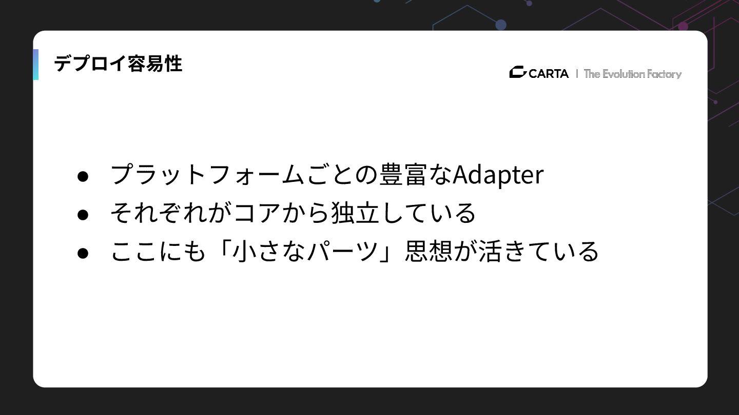 デプロイ容易性 • プラットフォームごとの豊富なAdapter • それぞれがコアから独⽴している • ここにも「⼩さなパーツ」思想が活きている