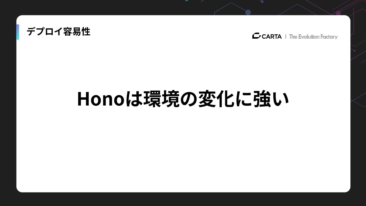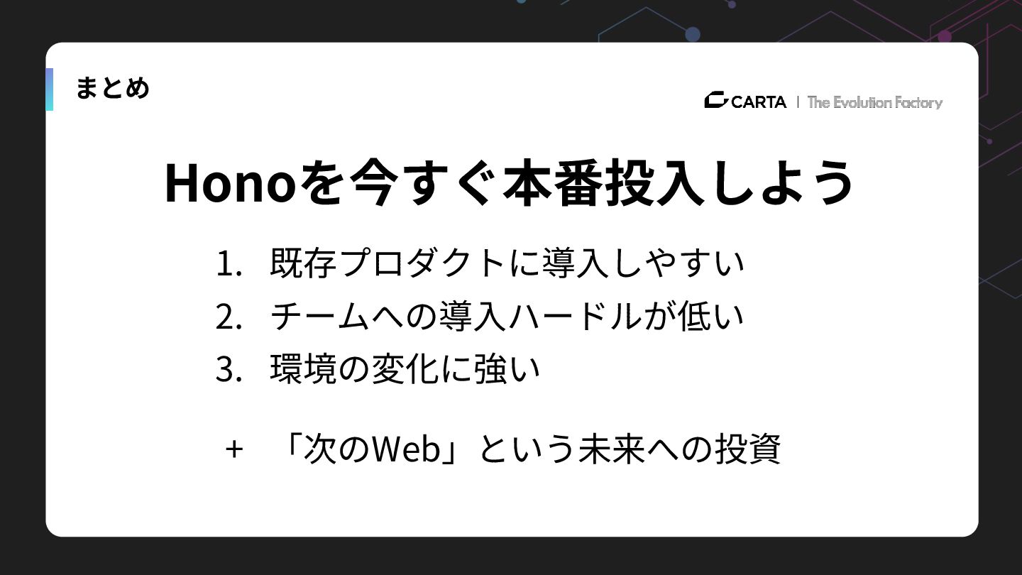 まとめ 1. 既存プロダクトに導⼊しやすい 2. チームへの導⼊ハードルが低い 3. 環境の変化に強い + 「次のWeb」という未来への投資 Honoを今すぐ本番投⼊しよう