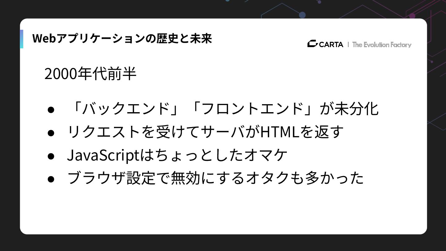 Webアプリケーションの歴史と未来 2000年代前半 • 「バックエンド」「フロントエンド」が未分化 • リクエストを受けてサーバがHTMLを返す • JavaScriptはちょっとしたオマケ • ブラウザ設定で無効にするオタクも多かった