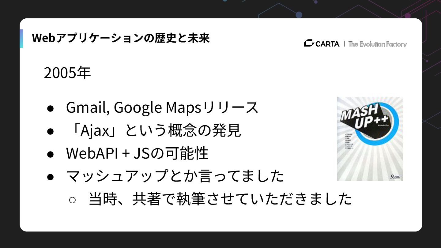 + JSの可能性 • マッシュアップとか⾔ってました ◦ 当時、共著で執筆させていただきました