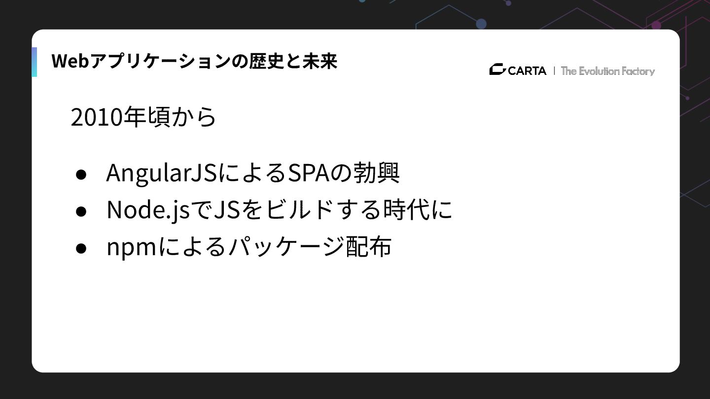 Webアプリケーションの歴史と未来 2010年頃から • AngularJSによるSPAの勃興 • Node.jsでJSをビルドする時代に • npmによるパッケージ配布
