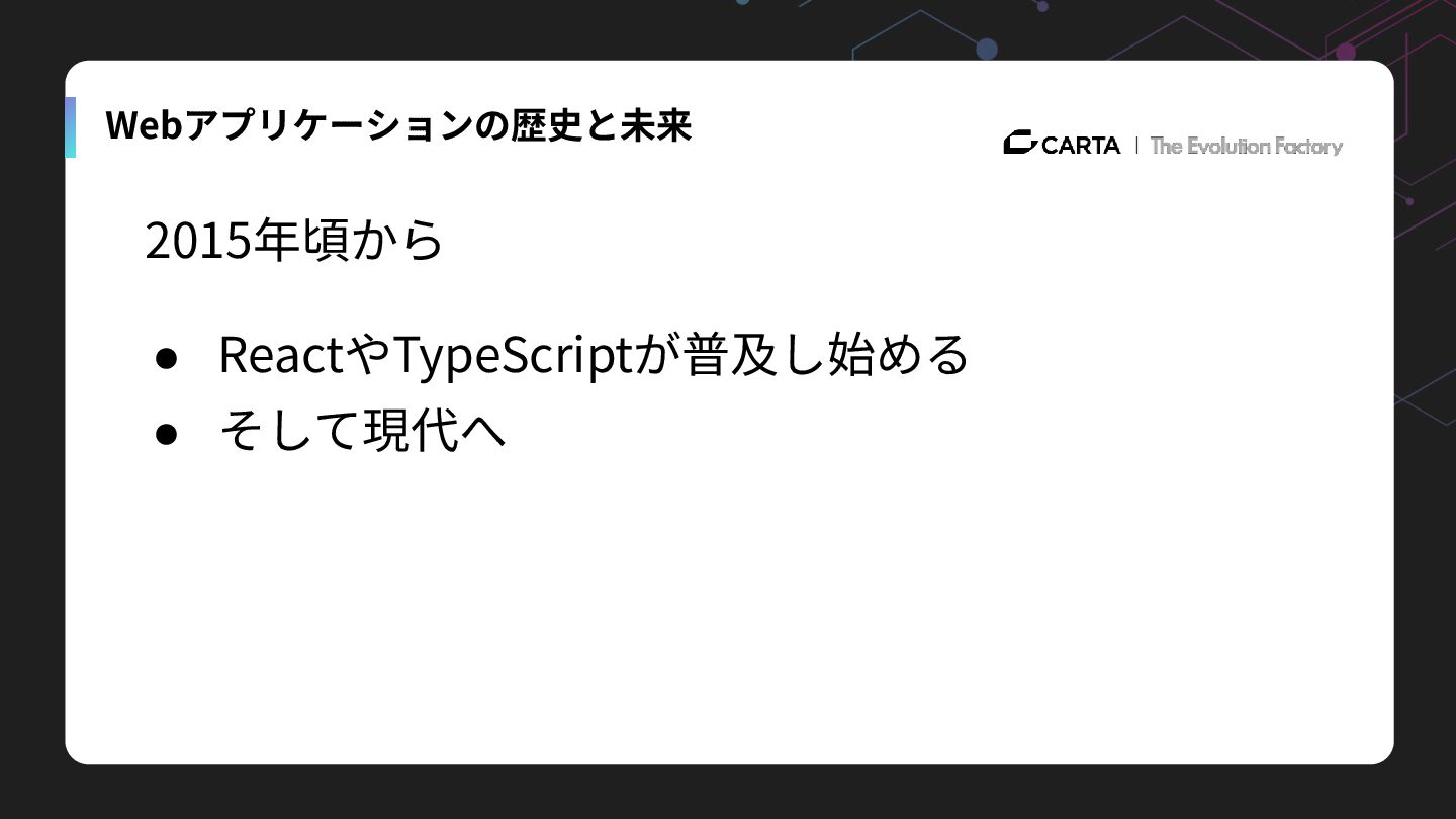 Webアプリケーションの歴史と未来 2015年頃から • ReactやTypeScriptが普及し始める • そして現代へ