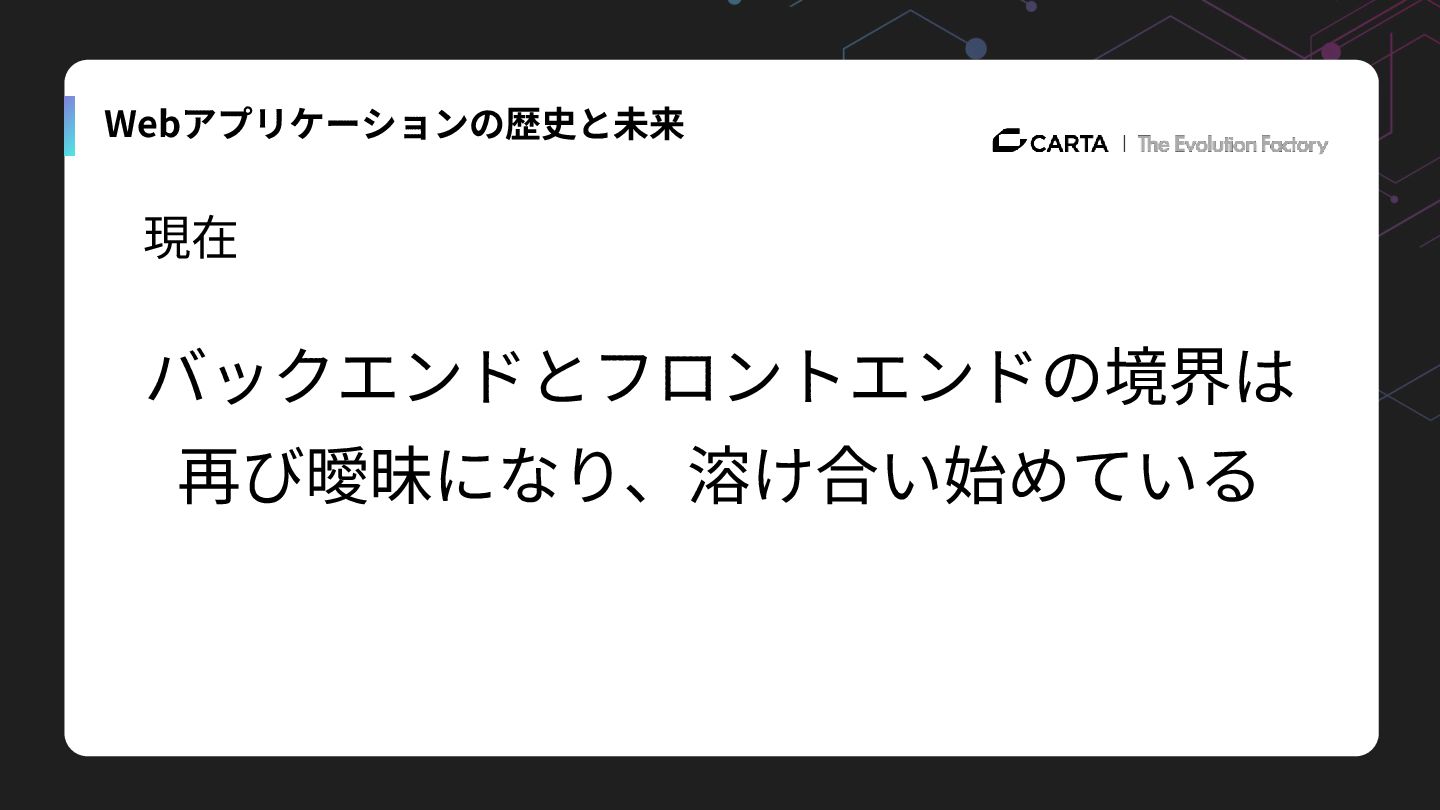 Webアプリケーションの歴史と未来 現在 バックエンドとフロントエンドの境界は 再び曖昧になり、溶け合い始めている