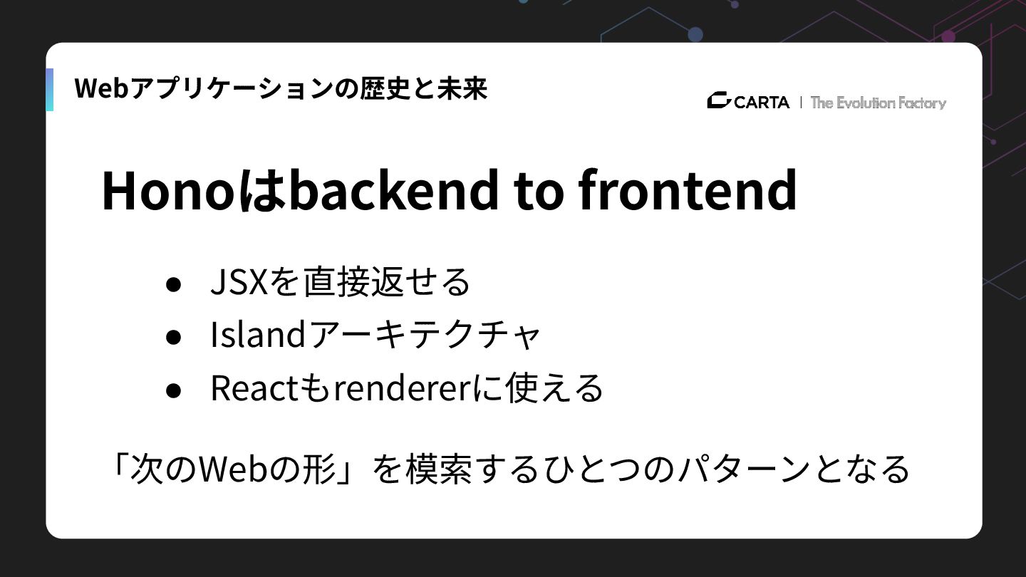 Webアプリケーションの歴史と未来 • JSXを直接返せる • Islandアーキテクチャ • Reactもrendererに使える Honoはbackend to frontend