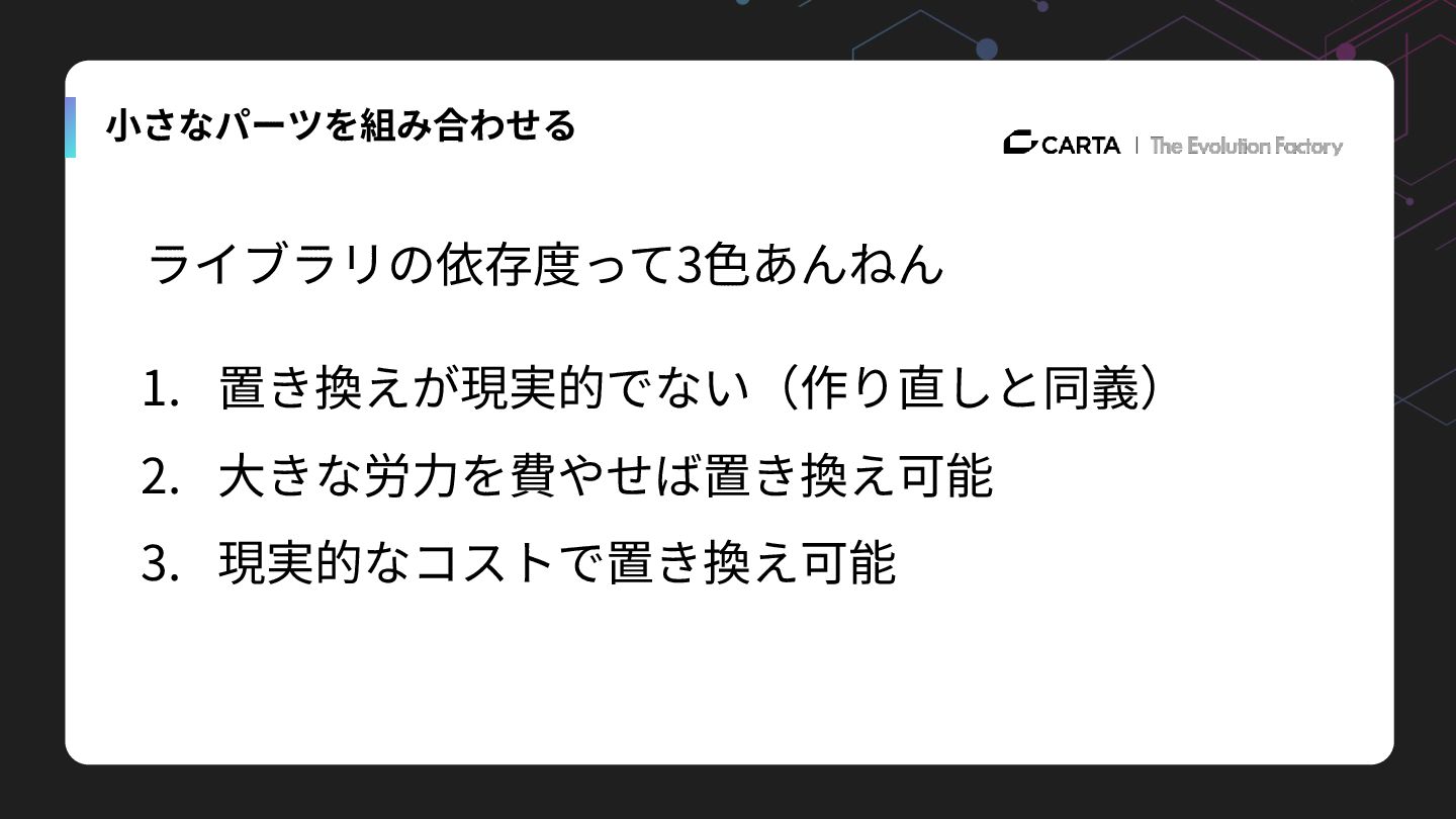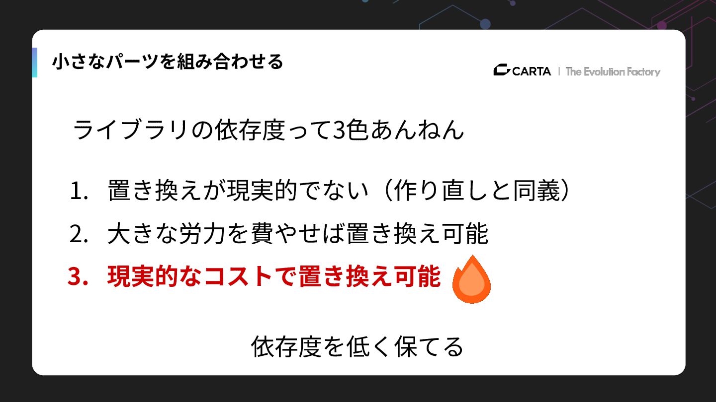 ⼩さなパーツを組み合わせる ライブラリの依存度って3⾊あんねん 1. 置き換えが現実的でない(作り直しと同義) 2. ⼤きな労⼒を費やせば置き換え可能 3. 現実的なコストで置き換え可能