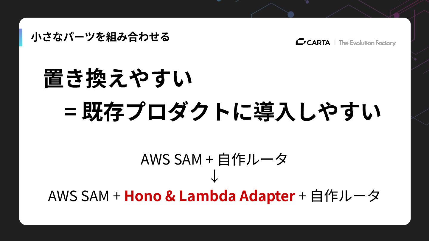 ⼩さなパーツを組み合わせる 置き換えやすい = 既存プロダクトに導⼊しやすい AWS SAM + ⾃作ルータ ↓ AWS