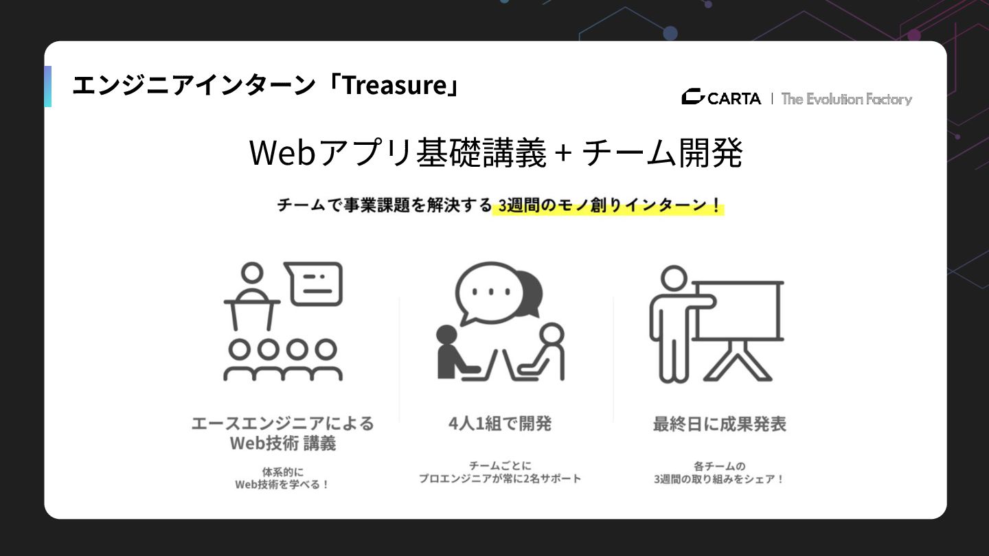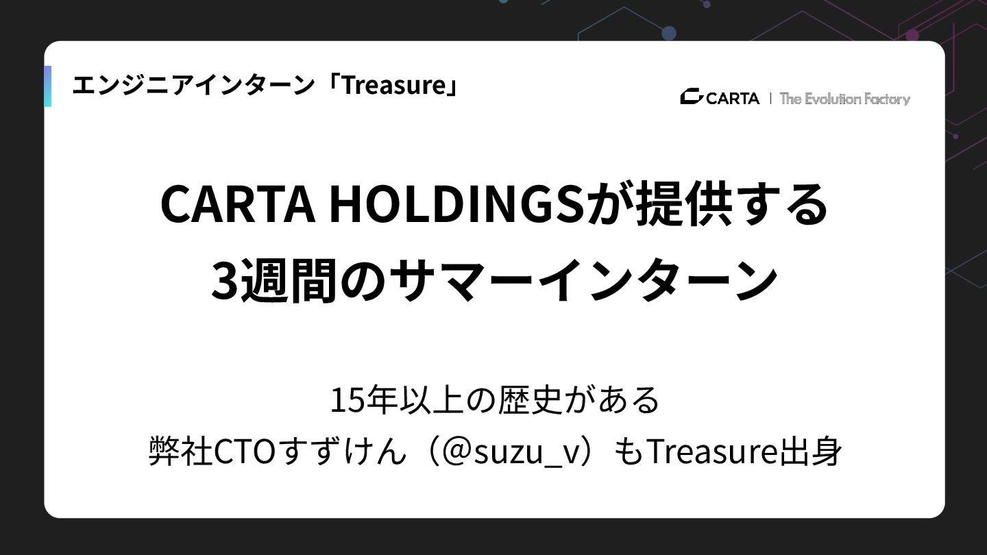 エンジニアインターン「Treasure」 CARTA HOLDINGSが提供する 3週間のサマーインターン 15年以上の歴史がある 弊社CTOすずけん(@suzu_v)もTreasure出⾝