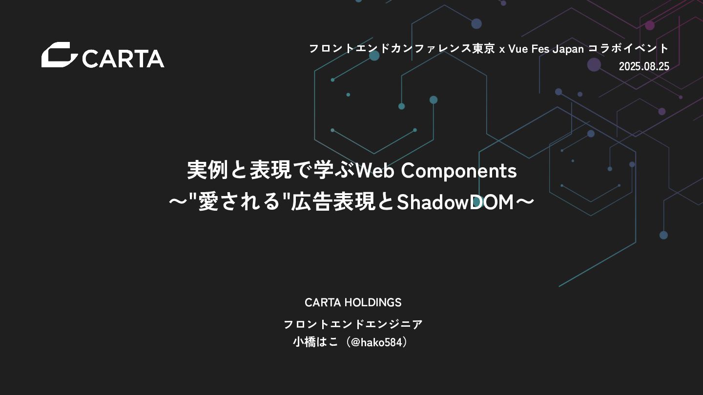 実例と表現で学ぶWeb Components 〜"愛される"広告表現とShadowDOM〜 CARTA HOLDINGS フロントエンドエンジニア 小橋はこ(@hako584) フロントエンドカンファレンス東京 x Vue