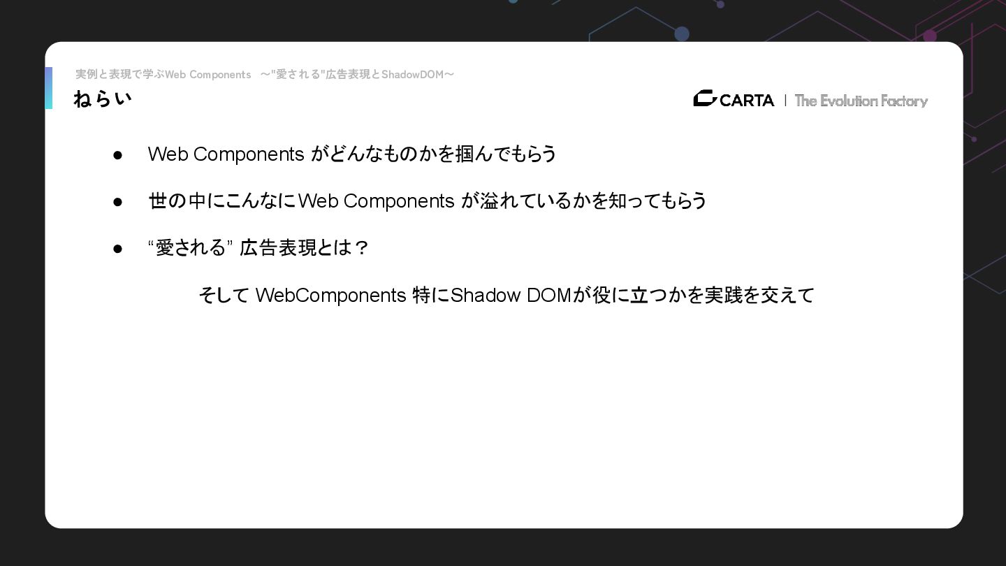 Components が溢れているかを知ってもらう • “愛される” 広告表現とは? そして WebComponents 特にShadow DOMが役に立つかを実践を交えて