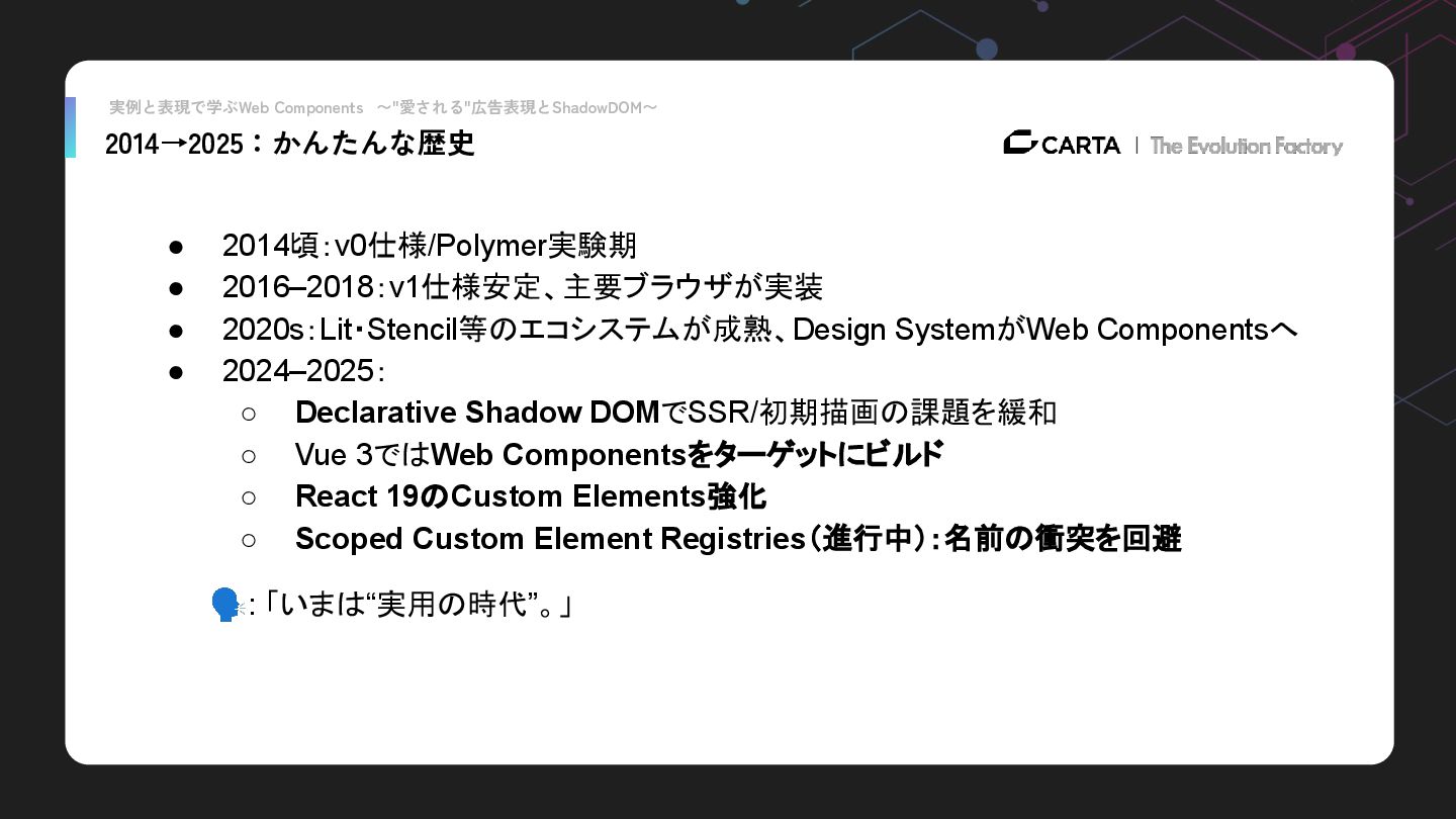 実例と表現で学ぶWeb Components 〜"愛される"広告表現とShadowDOM〜 2014→2025:かんたんな歴史 • 2014頃:v0仕様/Polymer実験期 • 2016–2018:v1仕様安定、主要ブラウザが実装 • 2020s:Lit・Stencil等のエコシステムが成熟、Design