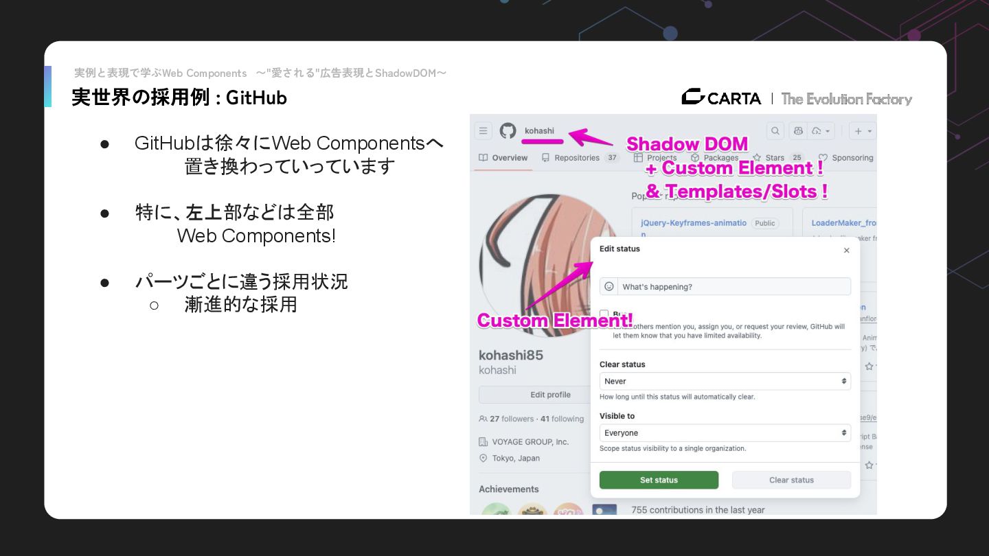 実例と表現で学ぶWeb Components 〜"愛される"広告表現とShadowDOM〜 実世界の採用例 : GitHub • GitHubは徐々にWeb Componentsへ 置き換わっていっています