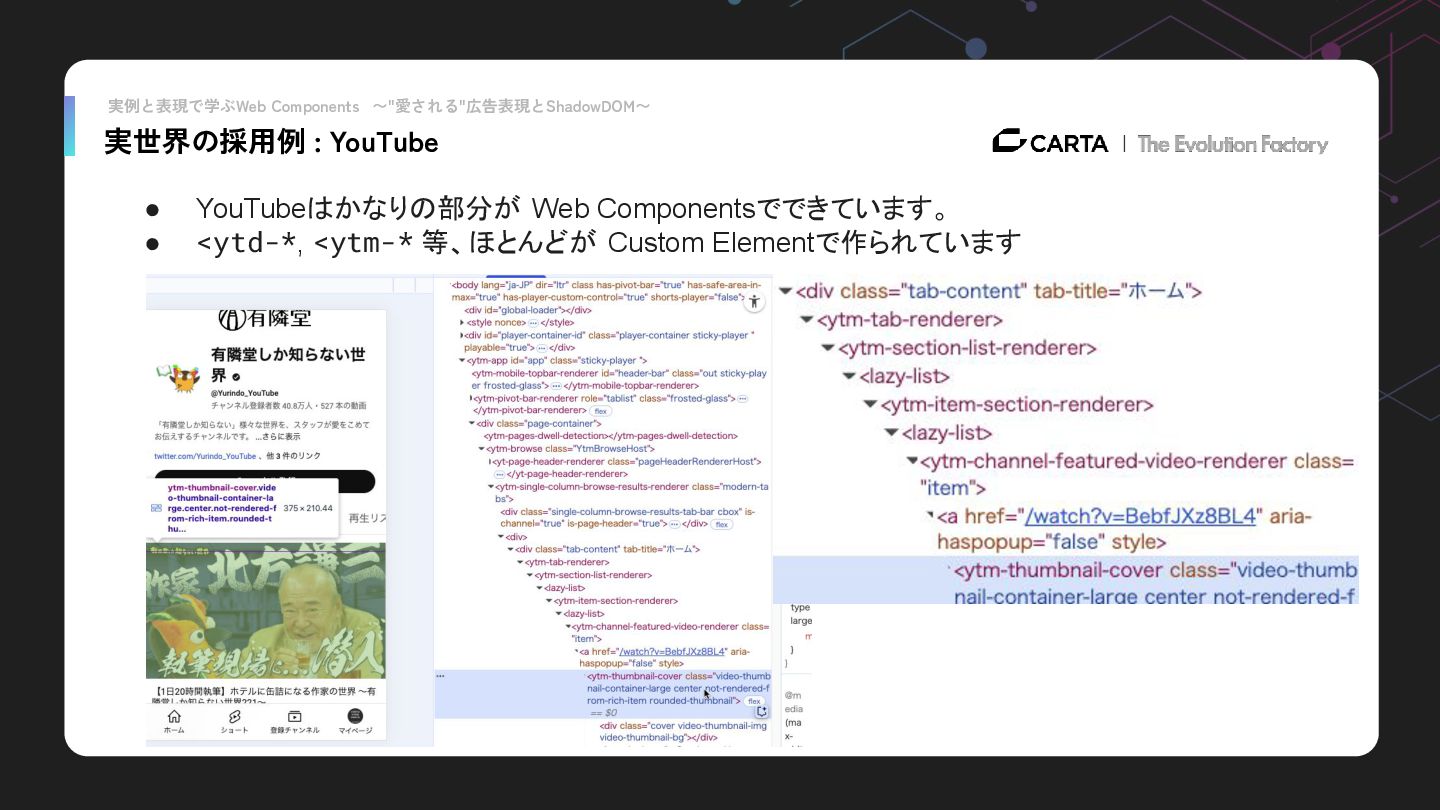実例と表現で学ぶWeb Components 〜"愛される"広告表現とShadowDOM〜 実世界の採用例 : YouTube • YouTubeはかなりの部分が Web Componentsでできています。