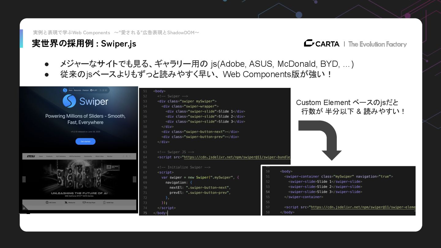 実世界の採用例 : Swiper.js • メジャーなサイトでも見る、ギャラリー用の js(Adobe, ASUS, McDonald, BYD, …) • 従来のjsベースよりもずっと読みやすく早い、 Web Components版が強い!