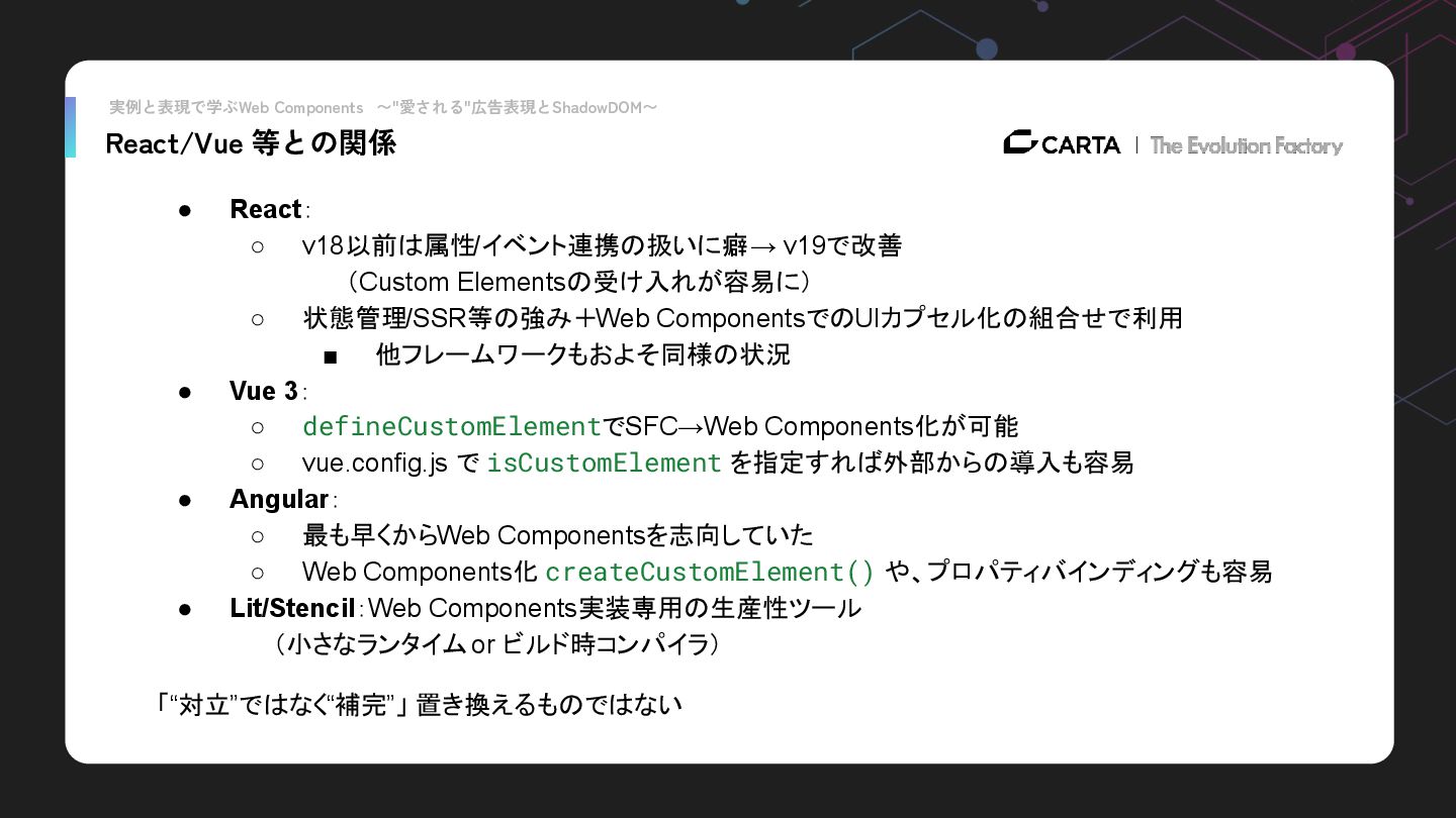 v19で改善 (Custom Elementsの受け入れが容易に) ◦ 状態管理/SSR等の強み+Web ComponentsでのUIカプセル化の組合せで利用 ▪ 他フレームワークもおよそ同様の状況 • Vue 3: ◦ defineCustomElementでSFC→Web Components化が可能 ◦ vue.config.js で isCustomElement を指定すれば外部からの導入も容易 • Angular: ◦ 最も早くからWeb Componentsを志向していた ◦ Web Components化 createCustomElement() や、プロパティバインディングも容易 • Lit/Stencil:Web Components実装専用の生産性ツール (小さなランタイム or ビルド時コンパイラ) 「“対立”ではなく“補完”」 置き換えるものではない