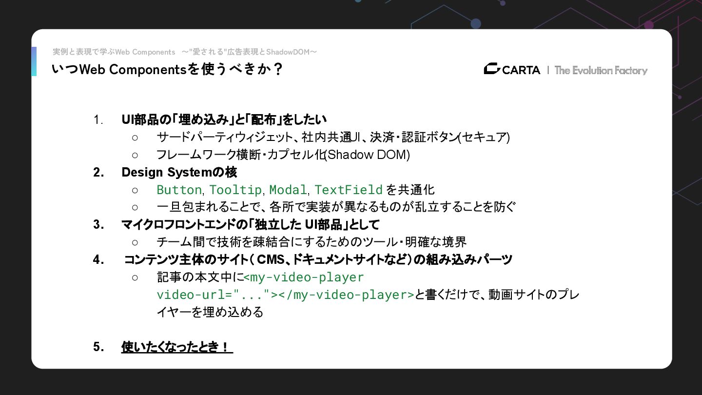 ◦ フレームワーク横断・カプセル化 (Shadow DOM) 2. Design Systemの核 ◦ Button, Tooltip, Modal, TextField を共通化 ◦ 一旦包まれることで、各所で実装が異なるものが乱立することを防ぐ 3. マイクロフロントエンドの「独立した UI部品」として ◦ チーム間で技術を疎結合にするためのツール・明確な境界 4. コンテンツ主体のサイト( CMS、ドキュメントサイトなど)の組み込みパーツ ◦ 記事の本文中に<my-video-player video-url="..."></my-video-player>と書くだけで、動画サイトのプレ イヤーを埋め込める 5. 使いたくなったとき!