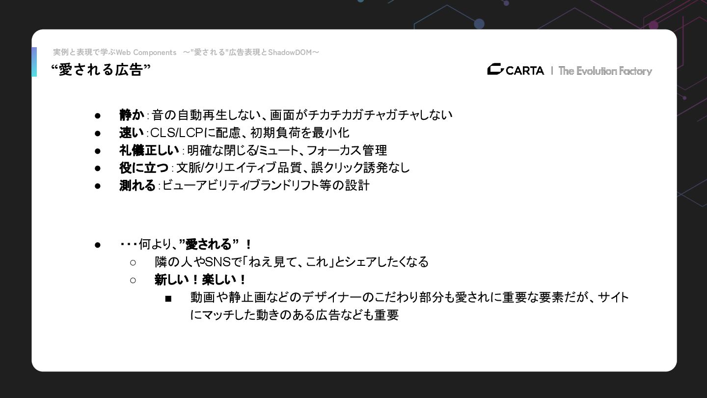 実例と表現で学ぶWeb Components 〜"愛される"広告表現とShadowDOM〜 “愛される広告” • 静か:音の自動再生しない、画面がチカチカガチャガチャしない • 速い:CLS/LCPに配慮、初期負荷を最小化 • 礼儀正しい:明確な閉じる/ミュート、フォーカス管理