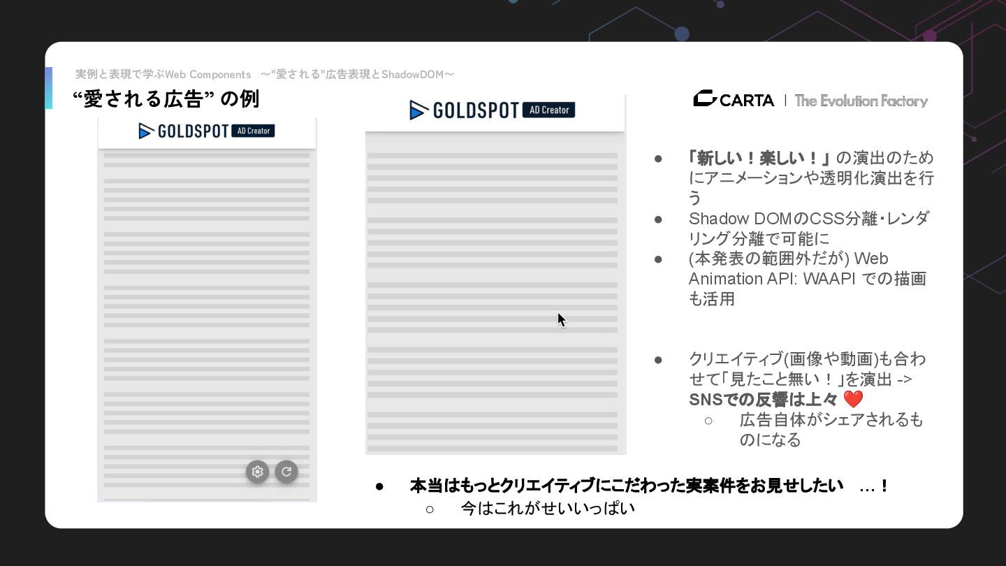 • 「新しい!楽しい!」 の演出のため にアニメーションや透明化演出を行 う • Shadow DOMのCSS分離・レンダ リング分離で可能に • (本発表の範囲外だが) Web Animation API: WAAPI での描画 も活用 • クリエイティブ(画像や動画)も合わ せて「見たこと無い!」を演出 -> SNSでの反響は上々 ❤ ◦ 広告自体がシェアされるも のになる