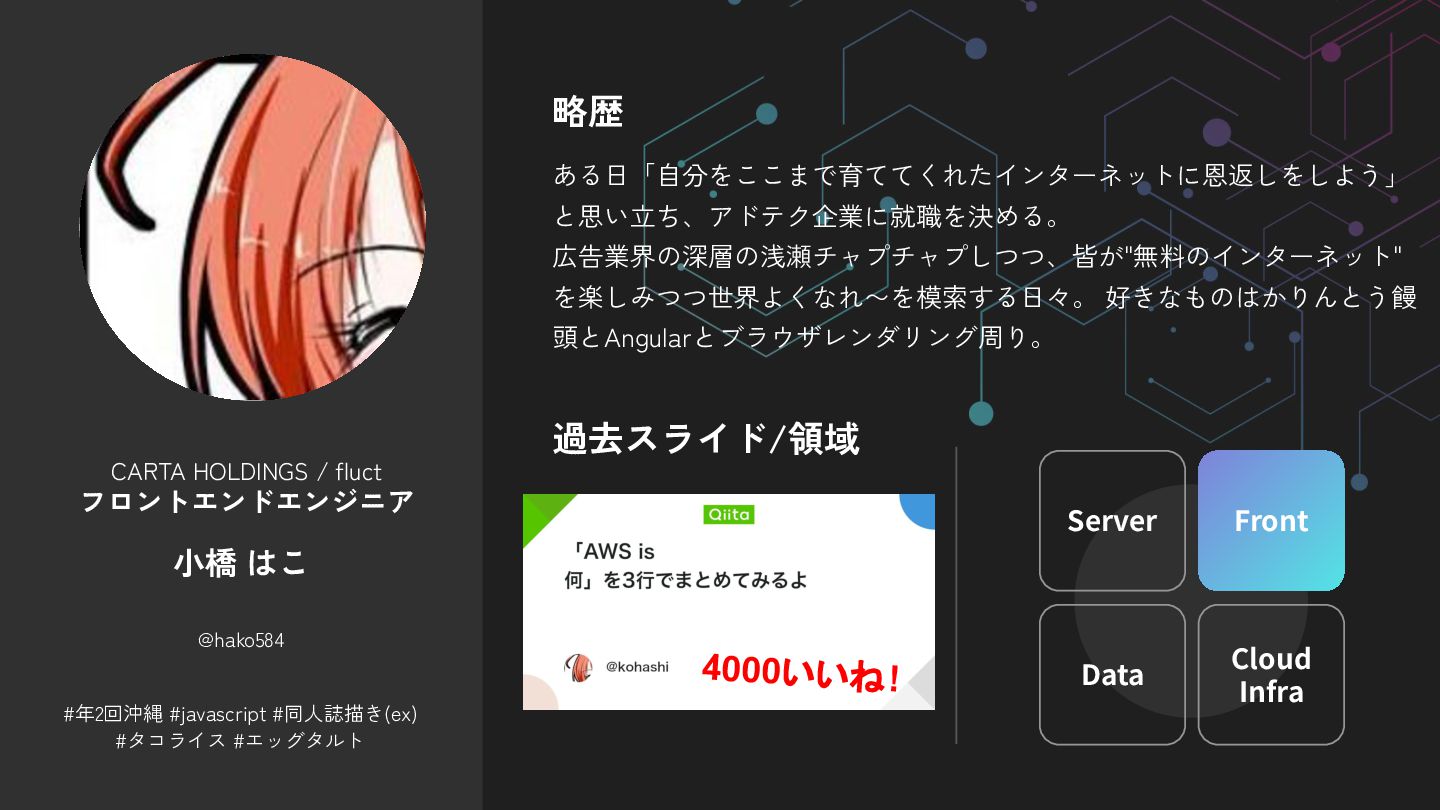 CARTA HOLDINGS / fluct フロントエンドエンジニア 小橋 はこ @hako584 略歴 ある日「自分をここまで育ててくれたインターネットに恩返しをしよう」