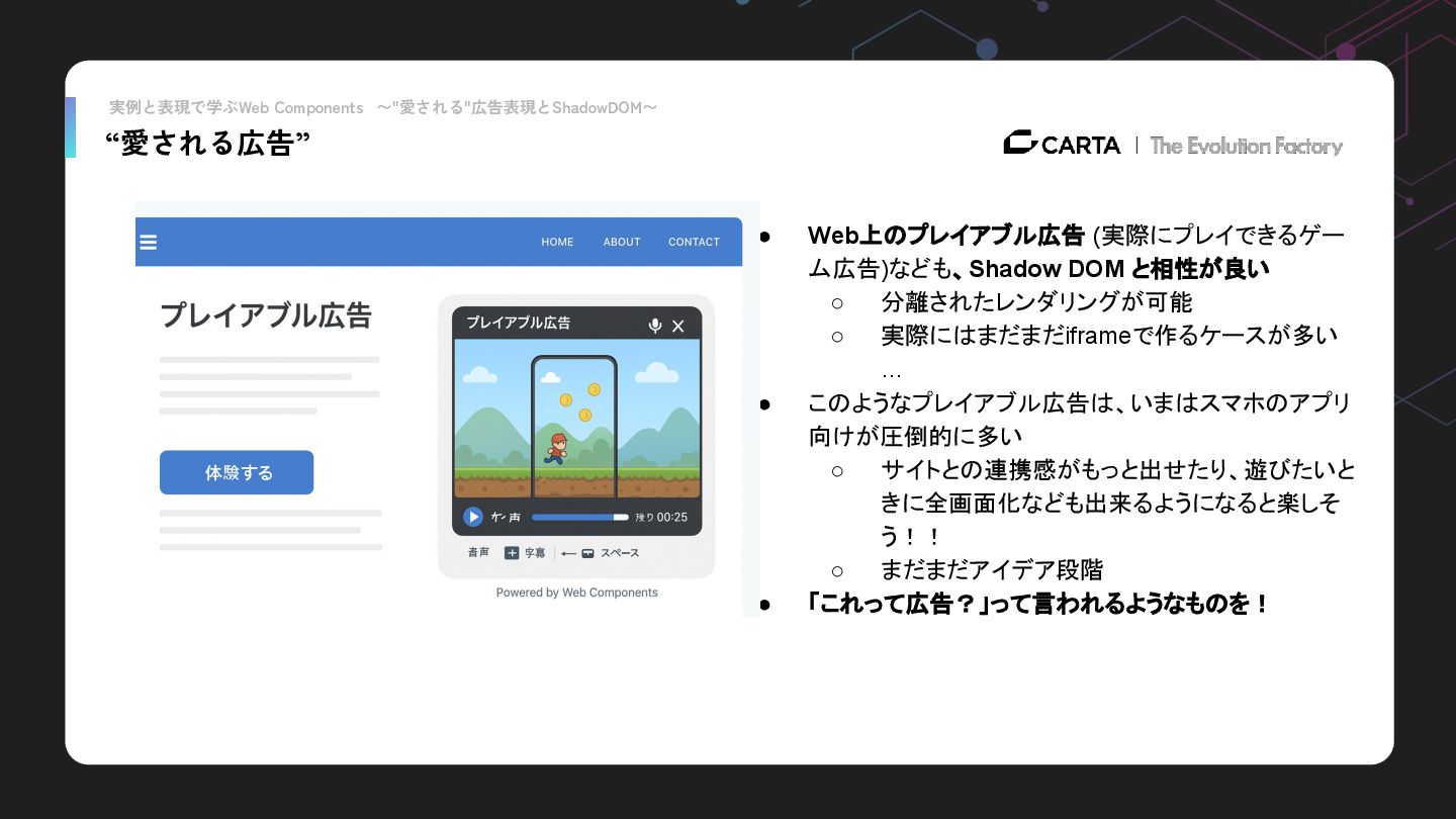 実例と表現で学ぶWeb Components 〜"愛される"広告表現とShadowDOM〜 “愛される広告” • Web上のプレイアブル広告 (実際にプレイできるゲー ム広告)なども、Shadow DOM と相性が良い