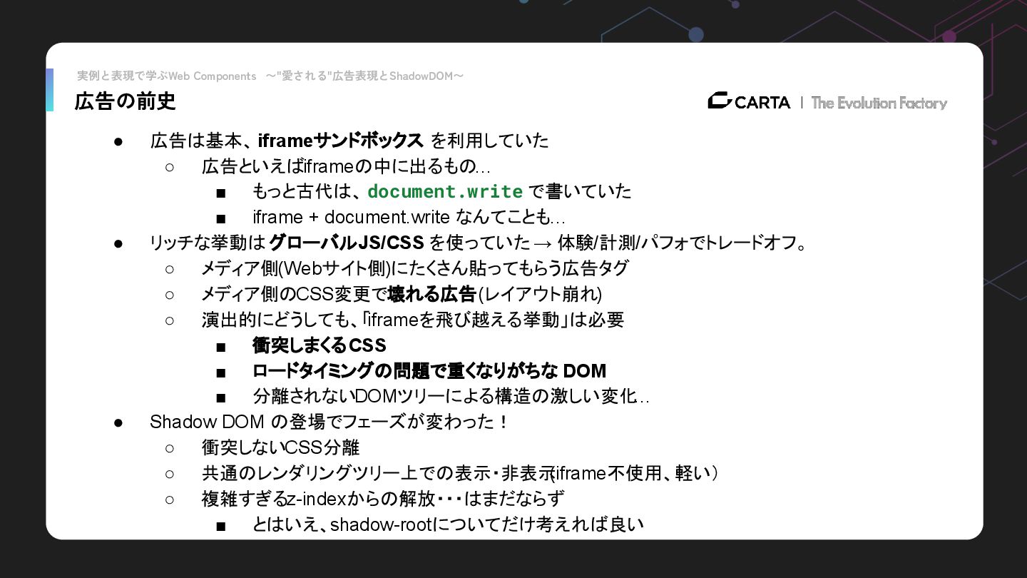 ▪ もっと古代は、 document.write で書いていた ▪ iframe + document.write なんてことも… • リッチな挙動は グローバルJS/CSS を使っていた → 体験/計測/パフォでトレードオフ。 ◦ メディア側(Webサイト側)にたくさん貼ってもらう広告タグ ◦ メディア側のCSS変更で壊れる広告(レイアウト崩れ) ◦ 演出的にどうしても、「iframeを飛び越える挙動」は必要 ▪ 衝突しまくるCSS ▪ ロードタイミングの問題で重くなりがちな DOM ▪ 分離されないDOMツリーによる構造の激しい変化 … • Shadow DOM の登場でフェーズが変わった! ◦ 衝突しないCSS分離 ◦ 共通のレンダリングツリー上での表示・非表示 (iframe不使用、軽い) ◦ 複雑すぎるz-indexからの解放・・・はまだならず ▪ とはいえ、shadow-rootについてだけ考えれば良い