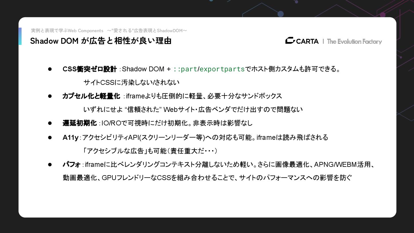 + ::part/exportpartsでホスト側カスタムも許可できる。 サイトCSSに汚染しない/されない • カプセル化と軽量化 :iframeよりも圧倒的に軽量、必要十分なサンドボックス いずれにせよ “信頼された” Webサイト・広告ベンダでだけ出すので問題ない • 遅延初期化 :IO/ROで可視時にだけ初期化。非表示時は影響なし • A11y:アクセシビリティAPI(スクリーンリーダー等)への対応も可能。iframeは読み飛ばされる 「アクセシブルな広告」も可能(責任重大だ・・・) • パフォ:iframeに比べレンダリングコンテキスト分離しないため軽い。さらに画像最適化、APNG/WEBM活用、 動画最適化、GPUフレンドリーなCSSを組み合わせることで、サイトのパフォーマンスへの影響を防ぐ