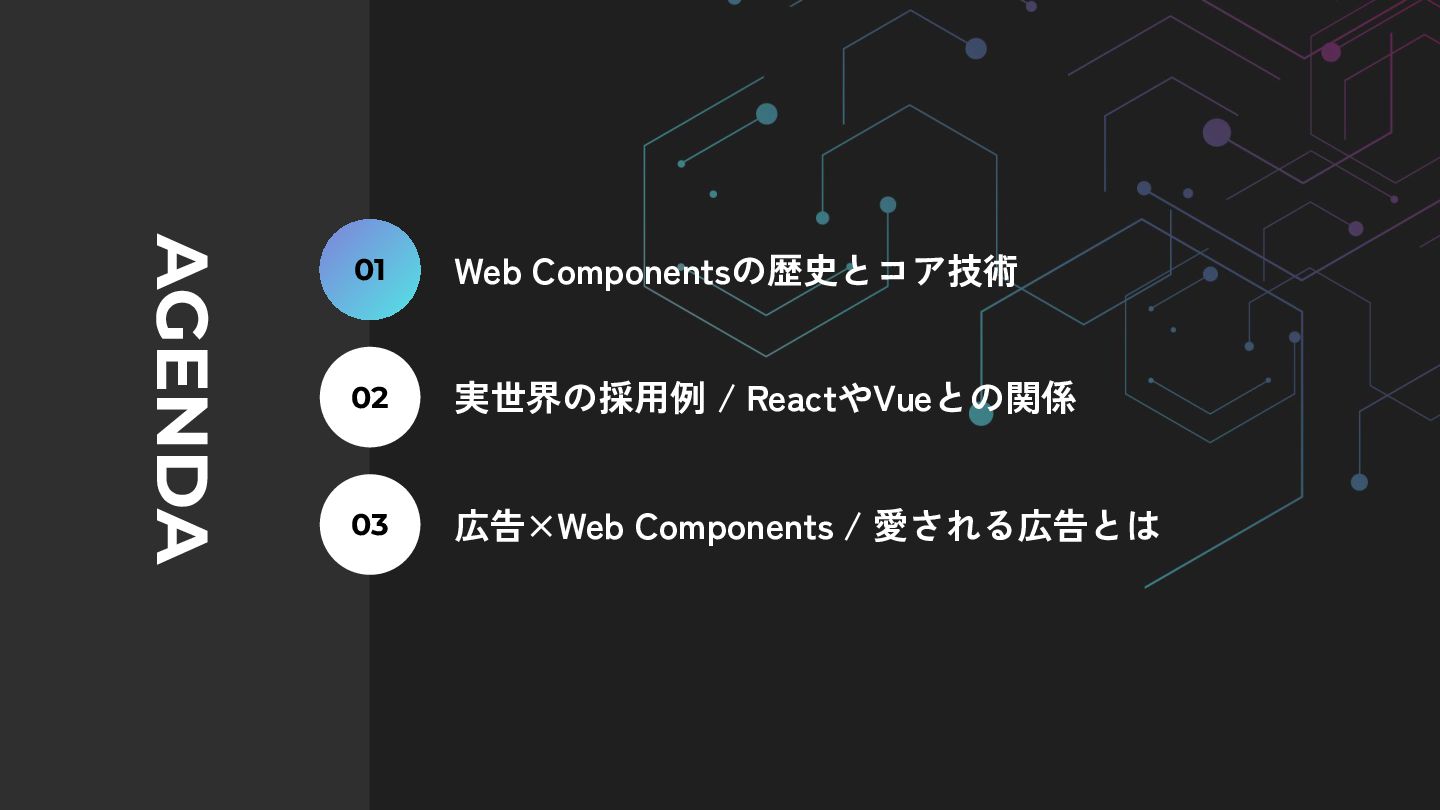 AGENDA 01 Web Componentsの歴史とコア技術 02 実世界の採用例 / ReactやVueとの関係 03 広告×Web