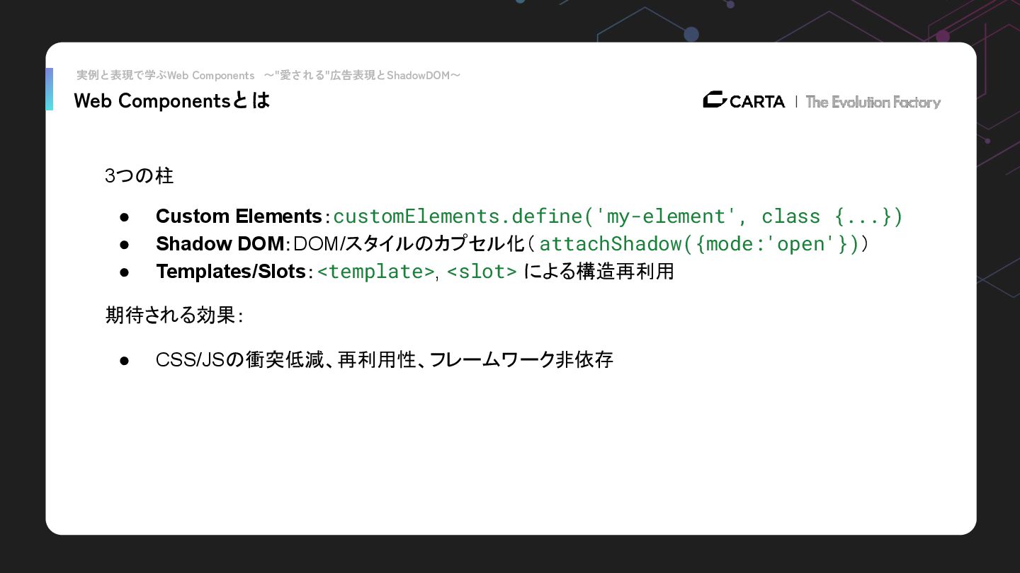 {...}) • Shadow DOM:DOM/スタイルのカプセル化( attachShadow({mode:'open'})) • Templates/Slots:<template>, <slot> による構造再利用 期待される効果: • CSS/JSの衝突低減、再利用性、フレームワーク非依存