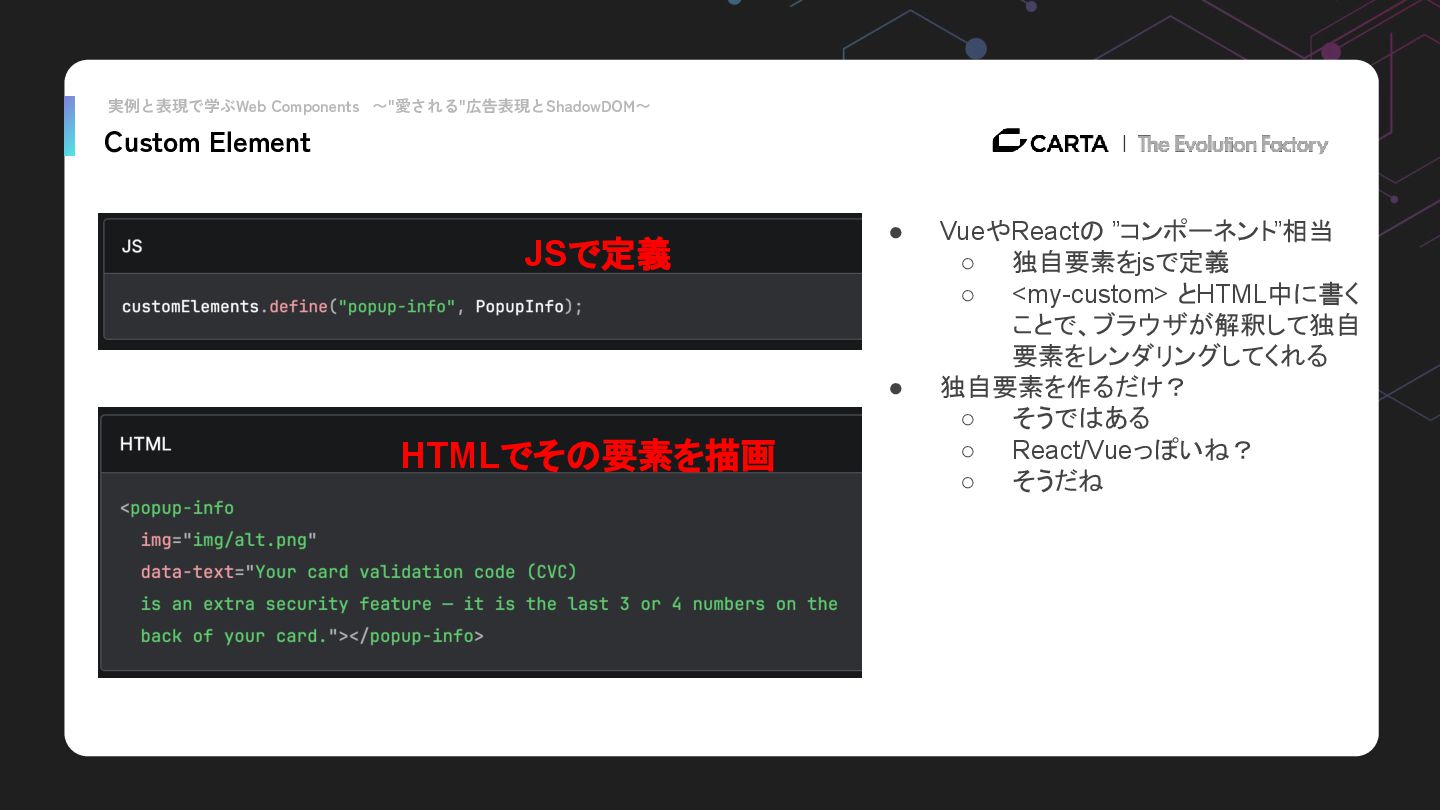 実例と表現で学ぶWeb Components 〜"愛される"広告表現とShadowDOM〜 Custom Element • VueやReactの ”コンポーネント”相当 ◦ 独自要素をjsで定義