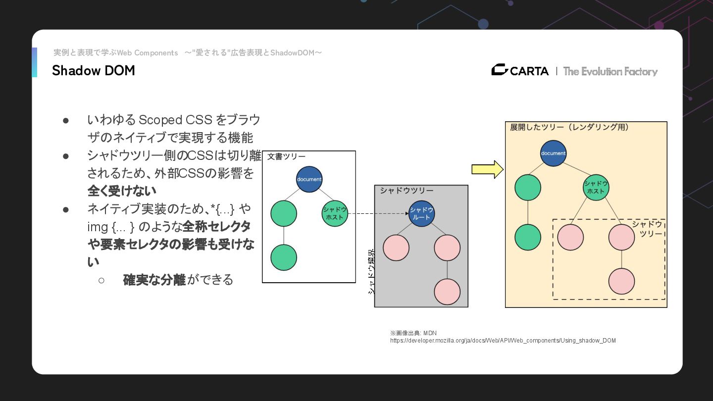 ザのネイティブで実現する機能 • シャドウツリー側のCSSは切り離 されるため、外部CSSの影響を 全く受けない • ネイティブ実装のため、*{...} や img {... } のような全称セレクタ や要素セレクタの影響も受けな い ◦ 確実な分離ができる ※画像出典: MDN https://developer.mozilla.org/ja/docs/Web/API/Web_components/Using_shadow_DOM