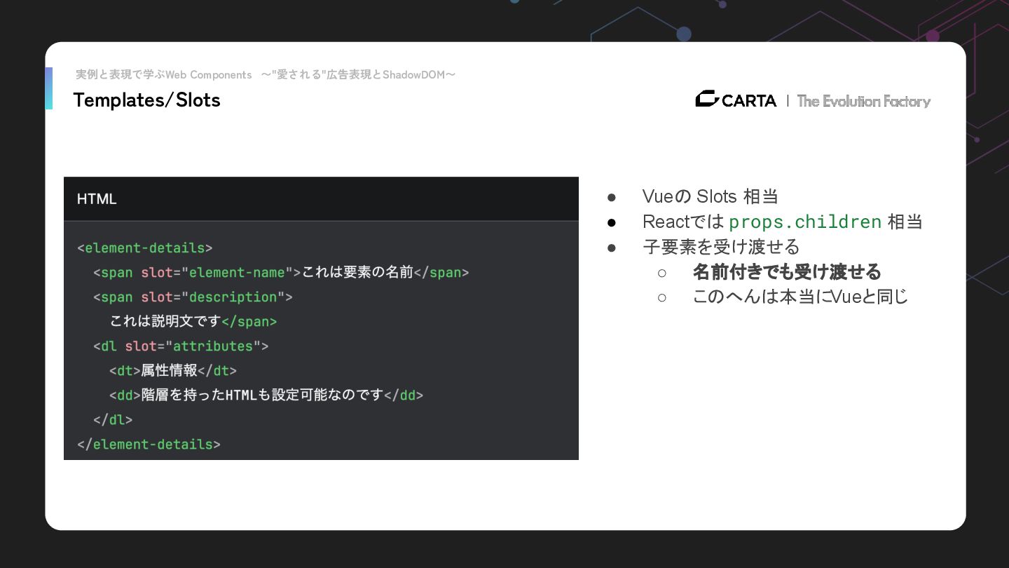 実例と表現で学ぶWeb Components 〜"愛される"広告表現とShadowDOM〜 Templates/Slots • Vueの Slots 相当 • Reactでは