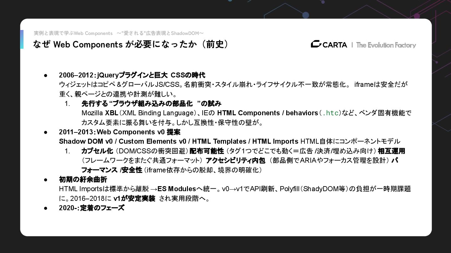 1. 先行する “ブラウザ組み込みの部品化 ”の試み Mozilla XBL(XML Binding Language)、IEの HTML Components / behaviors(.htc)など、ベンダ固有機能で カスタム要素に振る舞いを付与。しかし互換性・保守性の壁が。 • 2011–2013:Web Components v0 提案 Shadow DOM v0 / Custom Elements v0 / HTML Templates / HTML Imports HTML自体にコンポーネントモデル 1. カプセル化 (DOM/CSSの衝突回避)配布可能性 (タグ1つでどこでも動く=広告 /決済/埋め込み向け)相互運用 (フレームワークをまたぐ共通フォーマット) アクセシビリティ内包 (部品側でARIAやフォーカス管理を設計) パ フォーマンス /安全性 (iframe依存からの脱却、境界の明確化) • 初期の紆余曲折 HTML Importsは標準から離脱 →ES Modulesへ統一。v0→v1でAPI刷新、Polyfill(ShadyDOM等)の負担が一時期課題 に。2016–2018に v1が安定実装 され実用段階へ。 • 2020-:定着のフェーズ なぜ Web Components が必要になったか(前史)