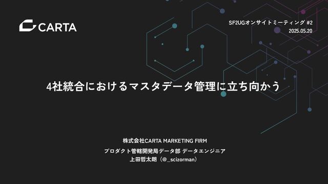 4社統合におけるマスタデータ管理に立ち向かう 株式会社CARTA MARKETING FIRM プロダクト管轄開発局データ部 データエンジニア 上田哲太朗(@_scizorman) SF2UGオンサイトミーティング #2 2025.05.20