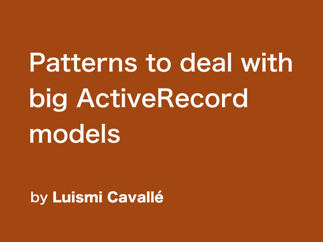In the last few years, the community has been proposing patterns and techniques to deal with big AR models. Presenters, Service objects, Concerns or DCI are only a few examples of solutions suggested to alleviate the pain caused by gigantic models.