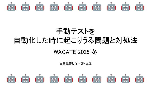 手動テストを 自動化した時に起こりうる問題と対処法 WACATE 2025 冬 🤖 🤖 🤖 🤖 🤖
