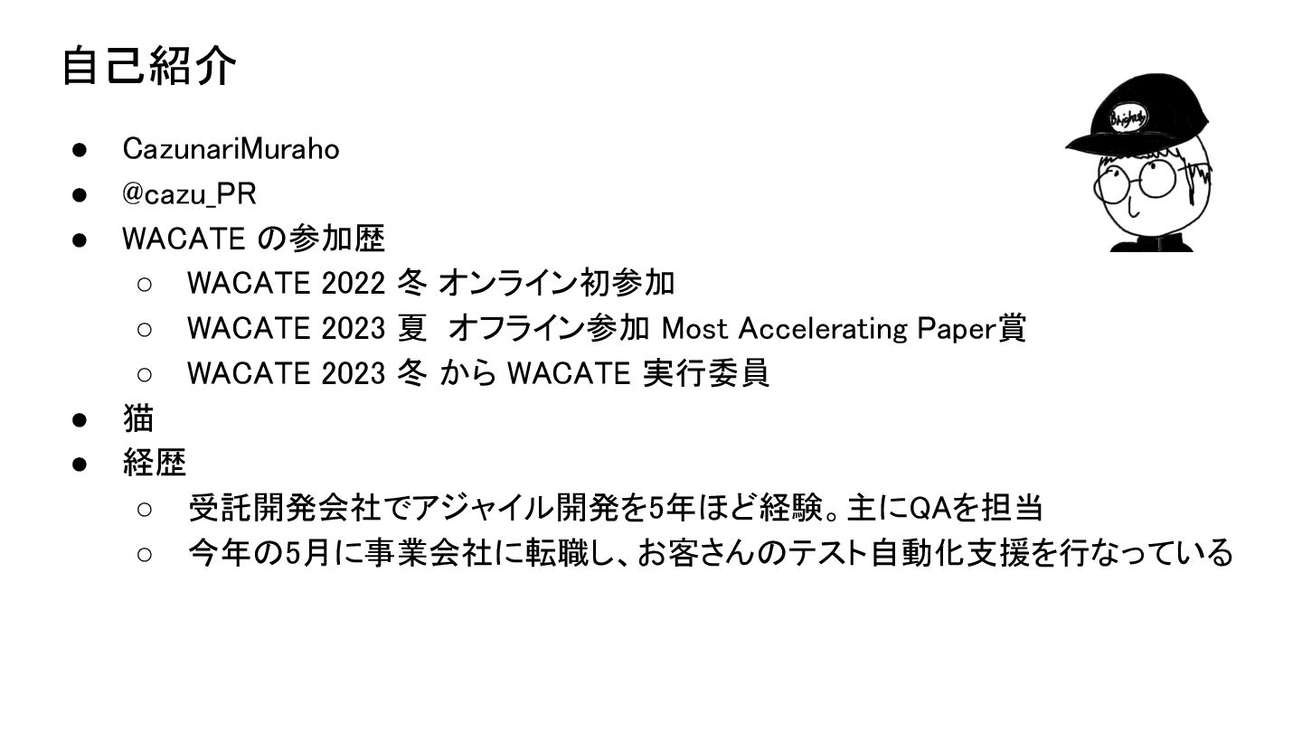 2022 冬 オンライン初参加 ◦ WACATE 2023 夏 オフライン参加 Most Accelerating Paper賞 ◦ WACATE 2023 冬 から WACATE 実行委員 • 猫 • 経歴 ◦ 受託開発会社でアジャイル開発を5年ほど経験。主にQAを担当 ◦ 今年の5月に事業会社に転職し、お客さんのテスト自動化支援を行なっている