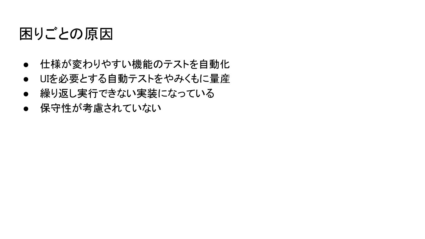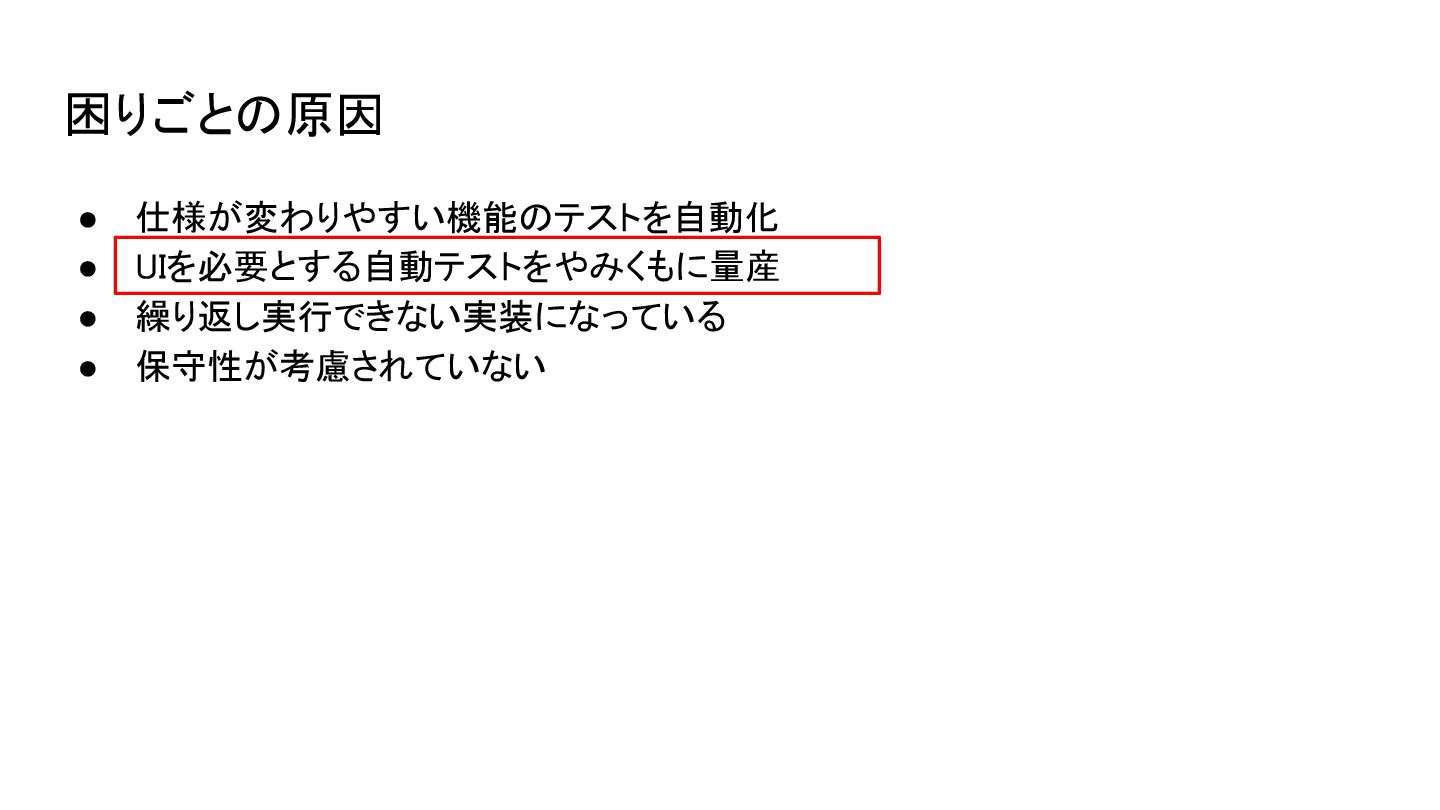 • 仕様が変わりやすい機能のテストを自動化 • UIを必要とする自動テストをやみくもに量産 • 繰り返し実行できない実装になっている • 保守性が考慮されていない