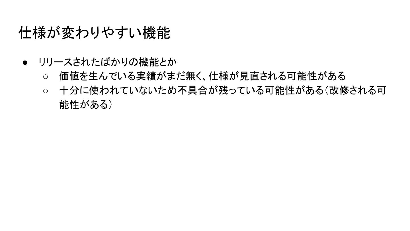 仕様が変わりやすい機能 • リリースされたばかりの機能とか ◦ 価値を生んでいる実績がまだ無く、仕様が見直される可能性がある ◦ 十分に使われていないため不具合が残っている可能性がある(改修される可 能性がある)