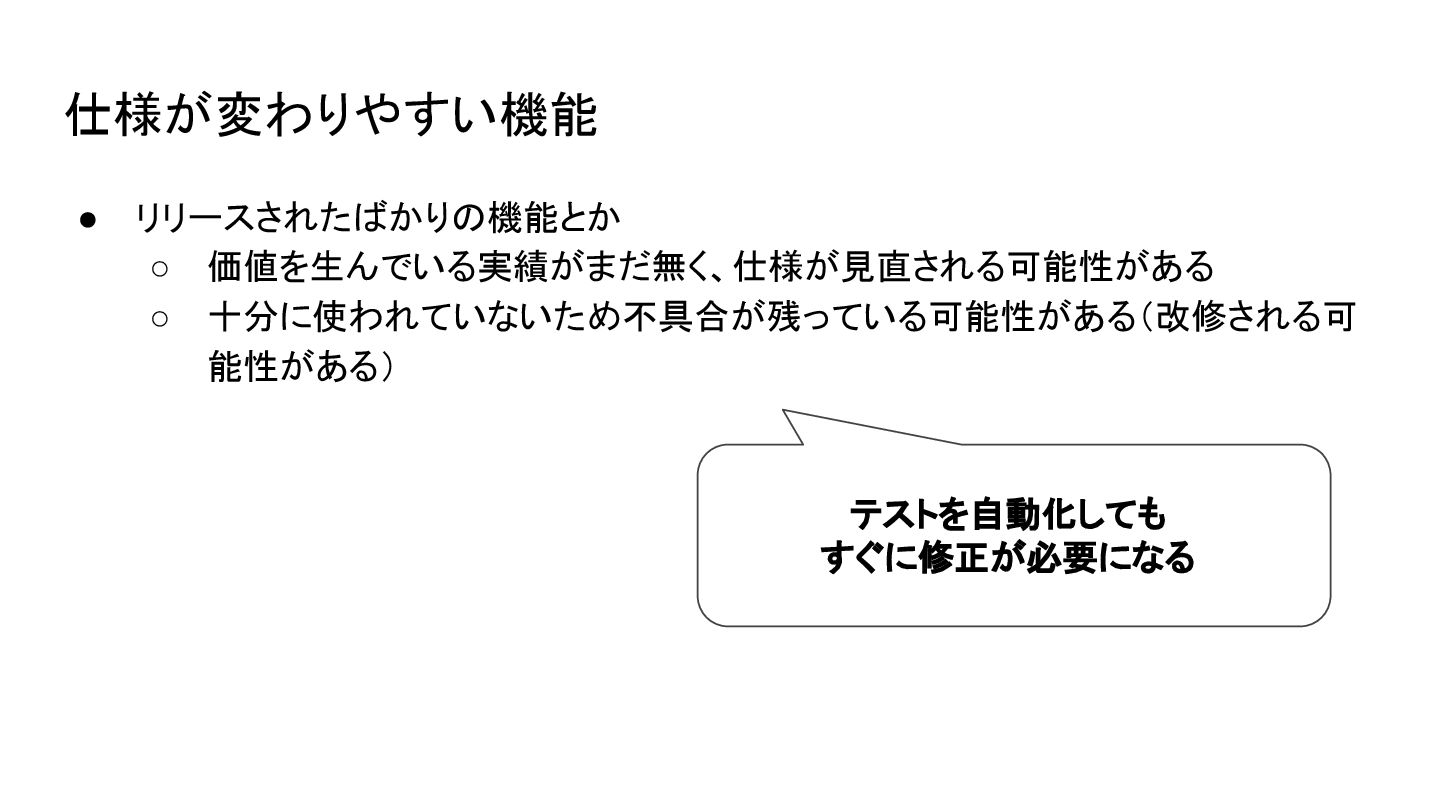 仕様が変わりやすい機能 • リリースされたばかりの機能とか ◦ 価値を生んでいる実績がまだ無く、仕様が見直される可能性がある ◦ 十分に使われていないため不具合が残っている可能性がある(改修される可 能性がある) テストを自動化しても