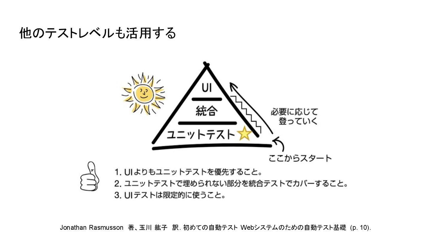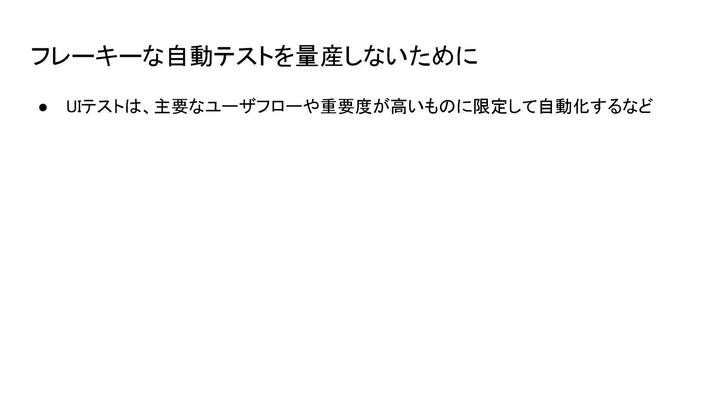 • UIテストは、主要なユーザフローや重要度が高いものに限定して自動化するなど フレーキーな自動テストを量産しないために