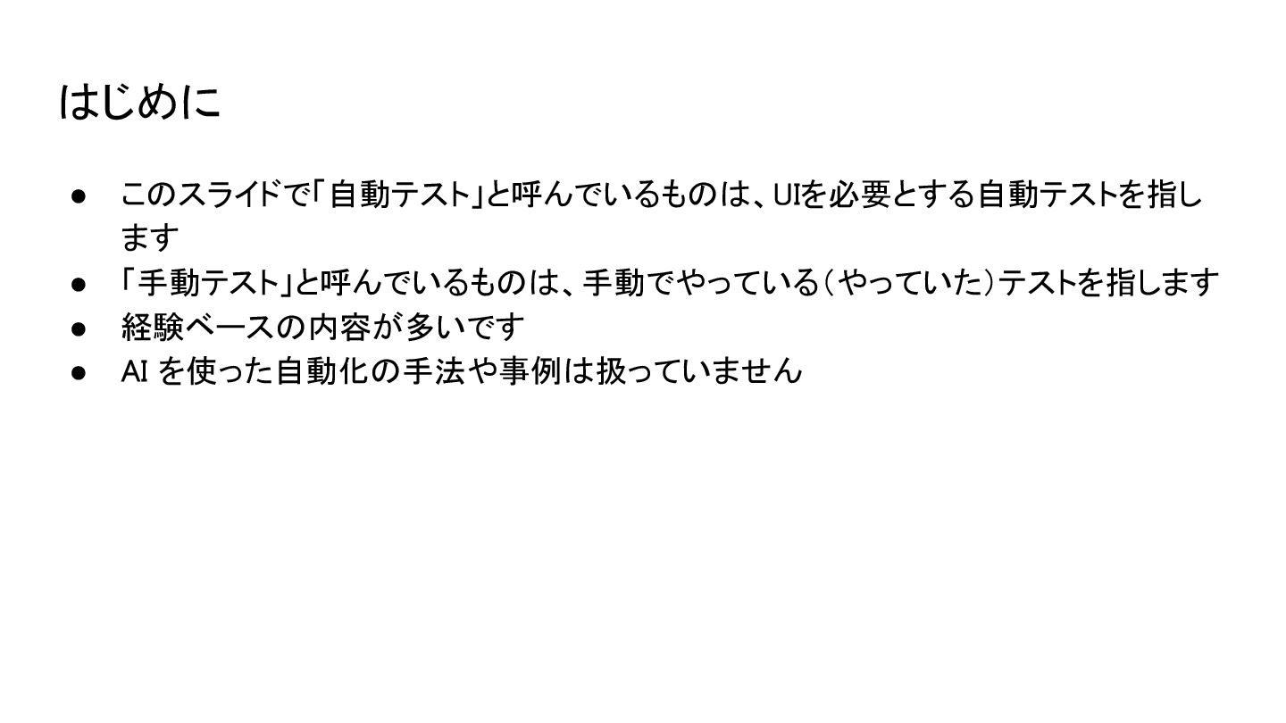 はじめに • このスライドで「自動テスト」と呼んでいるものは、UIを必要とする自動テストを指し ます • 「手動テスト」と呼んでいるものは、手動でやっている(やっていた)テストを指します • 経験ベースの内容が多いです • AI