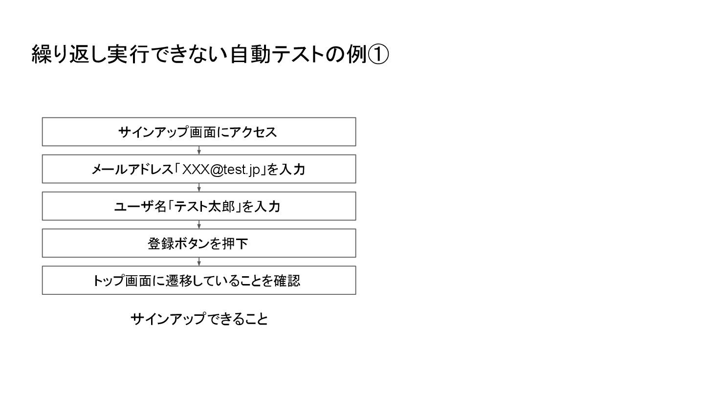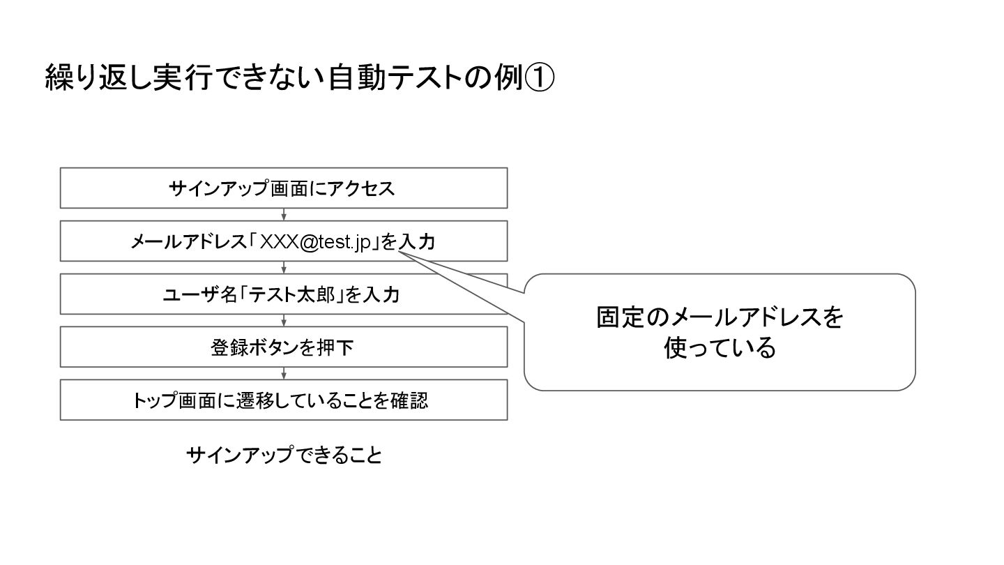 」を入力 ユーザ名「テスト太郎」を入力 登録ボタンを押下 サインアップできること トップ画面に遷移していることを確認 固定のメールアドレスを 使っている 繰り返し実行できない自動テストの例①