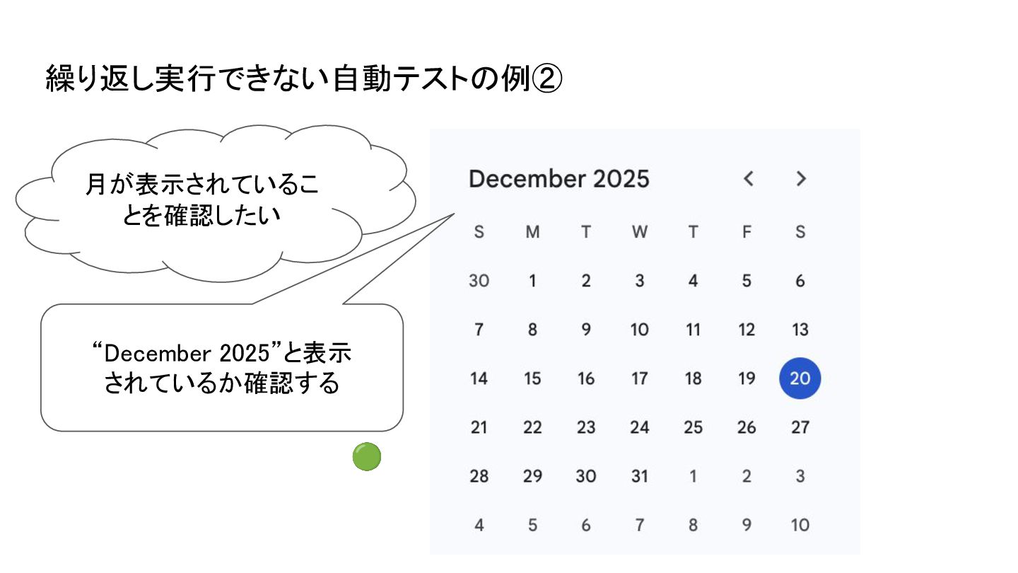 月が表示されているこ とを確認したい “December 2025”と表示 されているか確認する 🟢 繰り返し実行できない自動テストの例②