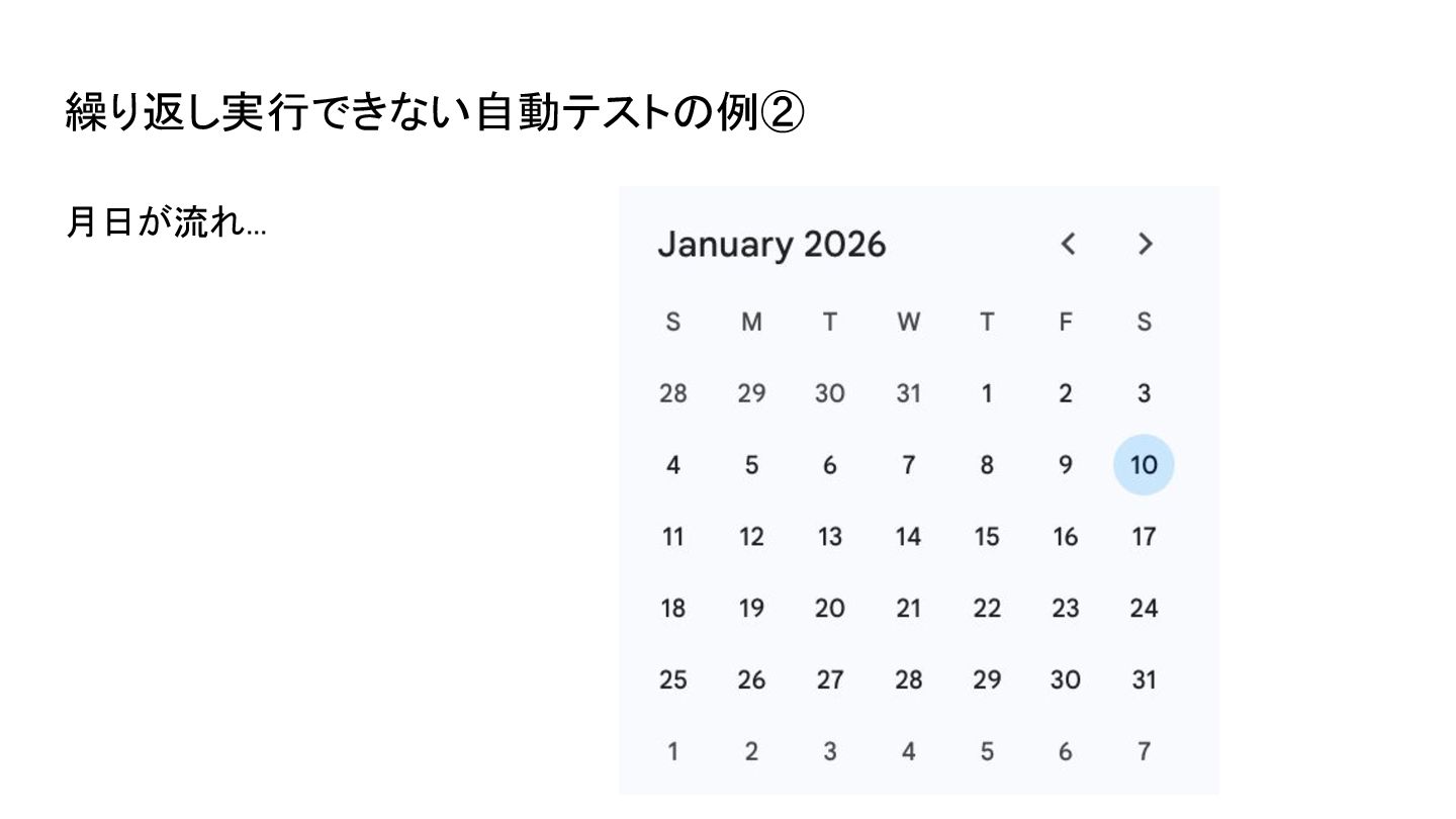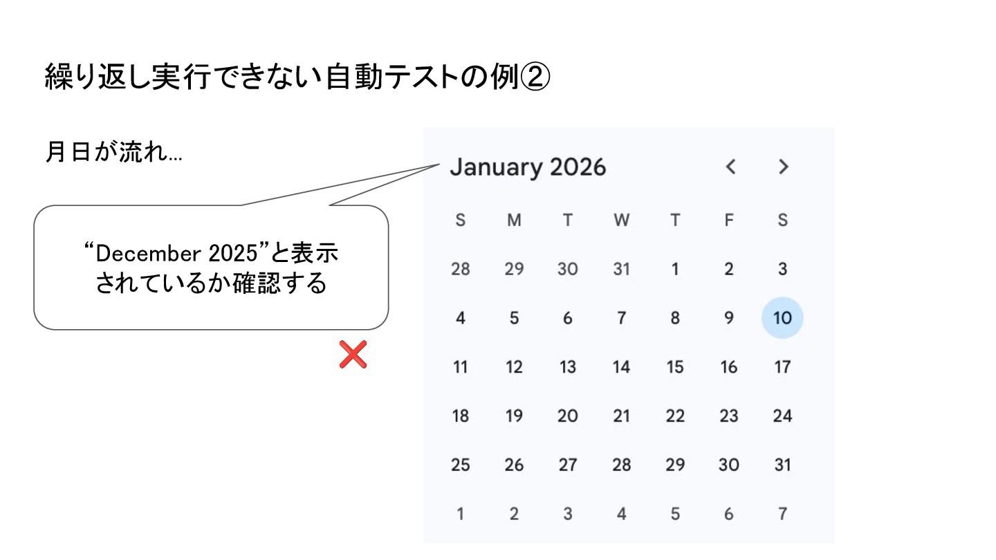 月日が流れ... “December 2025”と表示 されているか確認する ❌ 繰り返し実行できない自動テストの例②