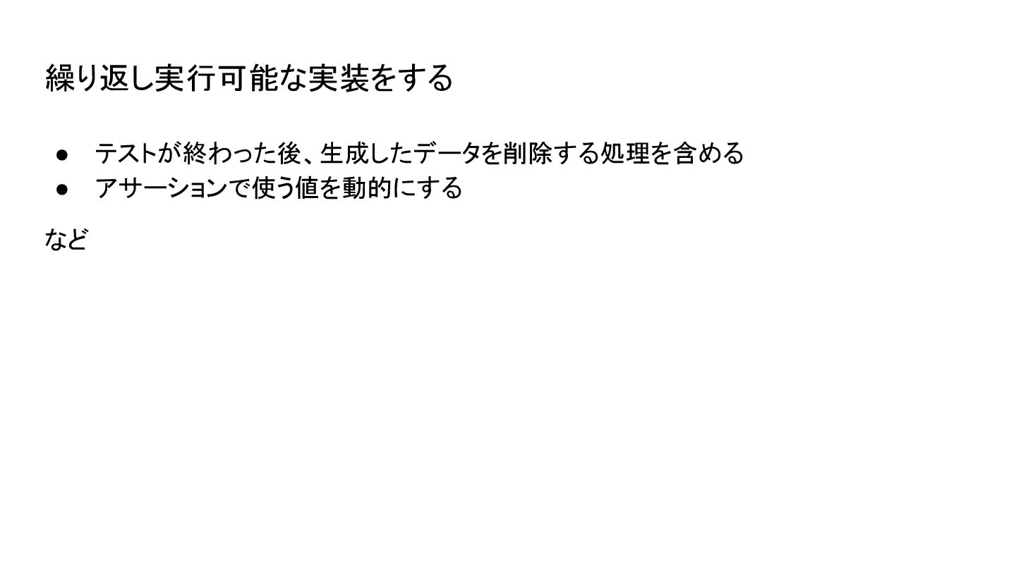 • テストが終わった後、生成したデータを削除する処理を含める • アサーションで使う値を動的にする など 繰り返し実行可能な実装をする