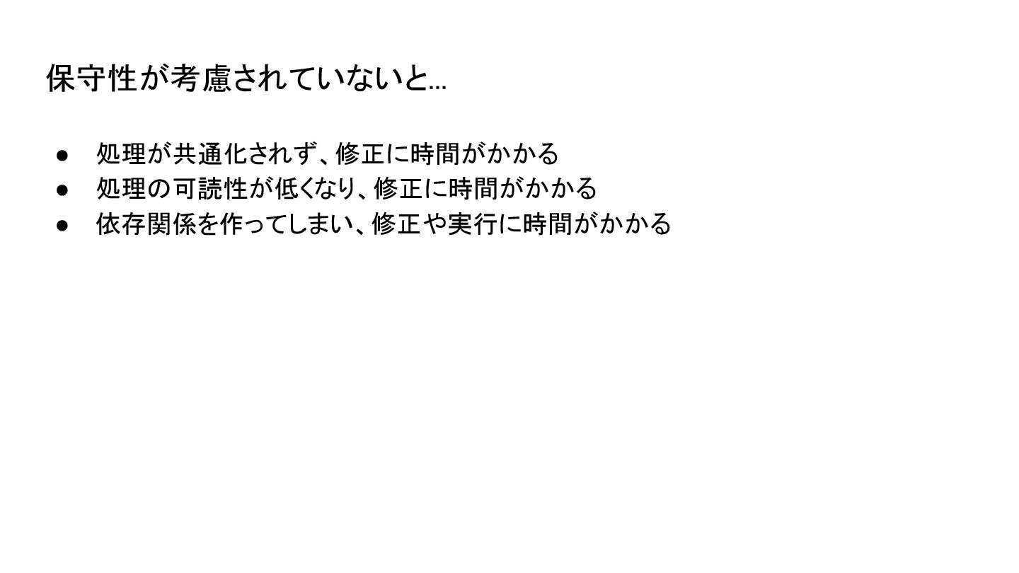 • 処理が共通化されず、修正に時間がかかる • 処理の可読性が低くなり、修正に時間がかかる • 依存関係を作ってしまい、修正や実行に時間がかかる 保守性が考慮されていないと...